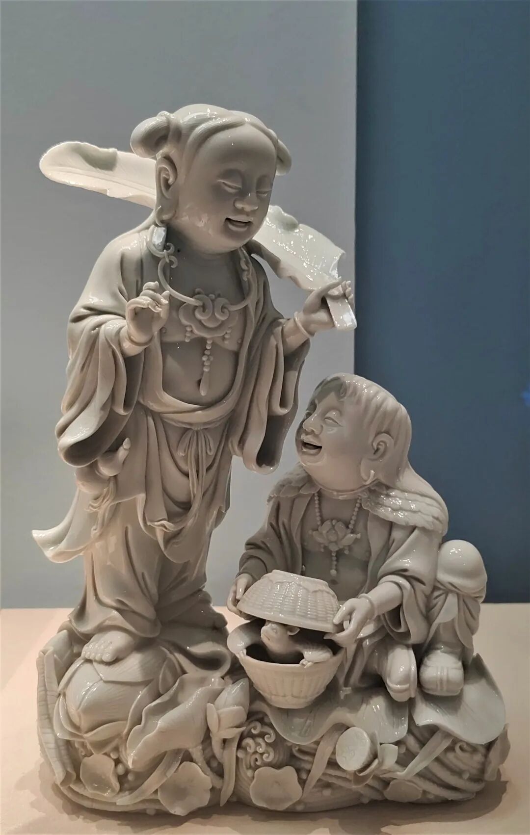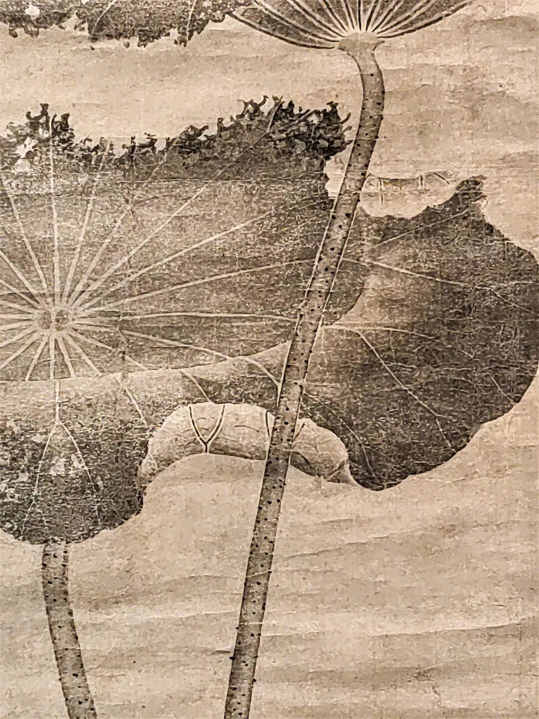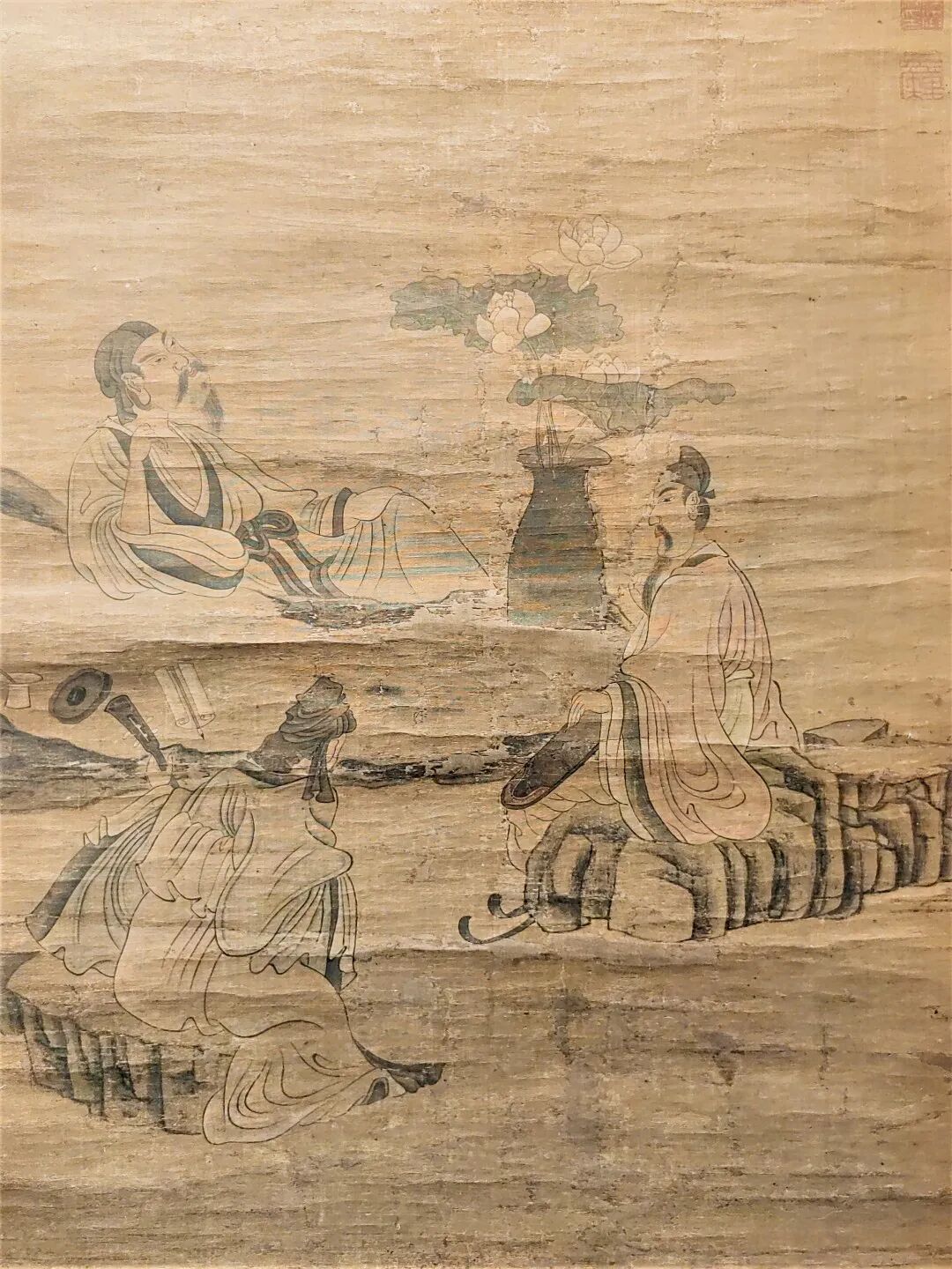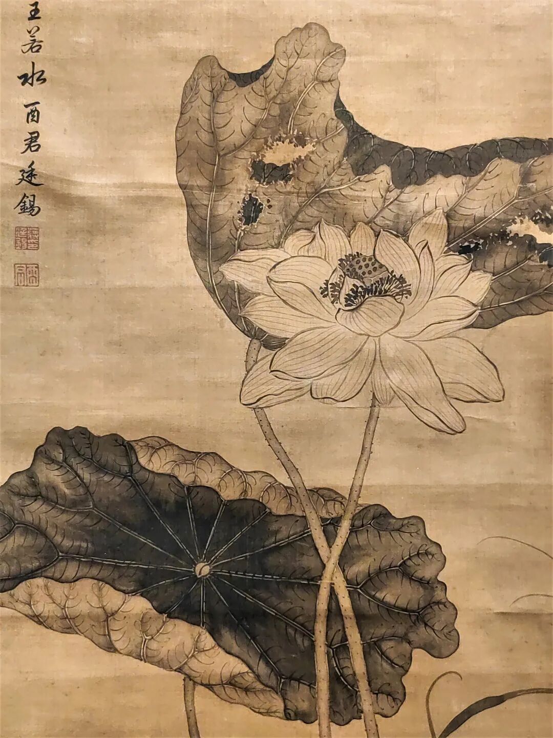 另一位莲花的著名“带货大 V”是周敦颐。宋代理学的影响下,士人阶层兴起了一股砥砺道德的风气。而莲作为植物当中典型的君子象征,成为了士人们极其喜爱的植物。周敦颐的《爱莲说》只是这种时代风气的一个缩影。但他的《爱莲说》如此知名,以至于传统纹样中直接多了“爱莲图”这种纹饰。“爱莲图”往往画着为旁人讲解莲花的周敦颐。因此民间又叫做“茂叔爱莲图”(周敦颐字茂叔)。本次展览展出了明代著名画家陈洪绶的绢本《爱莲图》,可以一睹明人心目中这位濂溪先生的风采。
