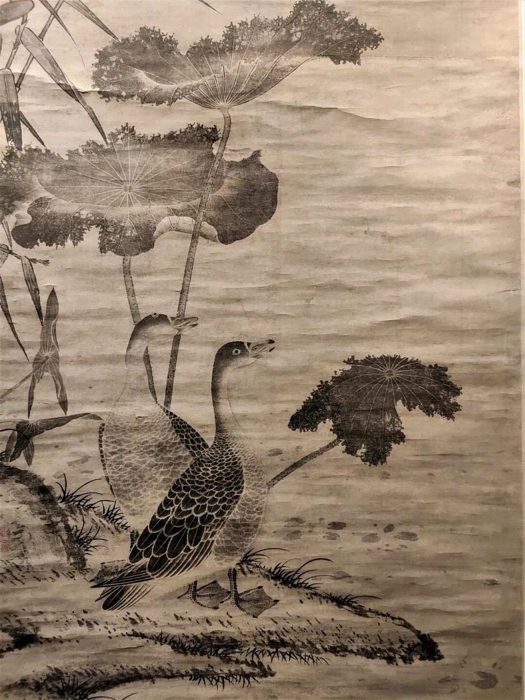 这一方则更为生动。两艘船正行进在莲塘中,仔细辨认,还能看见莲花、莲蓬。小狗从船上探出头,仿佛正在和水禽嬉戏。右方一人正在援弓缴而射鸟。