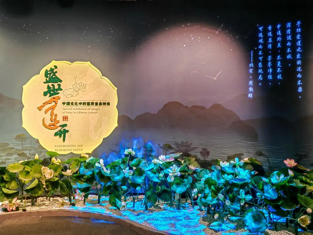 “盛世莲开——中国文化中的莲荷意象”特展位于四川博物院一楼临展 2 号和 3 号厅,展出时间为 2023 年 6 月 9 日至 10 月 8 日。本次特展历时 5 年精心策划,全国 44 家文博单位鼎力相助,汇聚了 218 件莲荷精品文物。分序厅,泥根玉雪原无染、莲花影里数楼台、映日荷花别样红三个单元和尾厅。