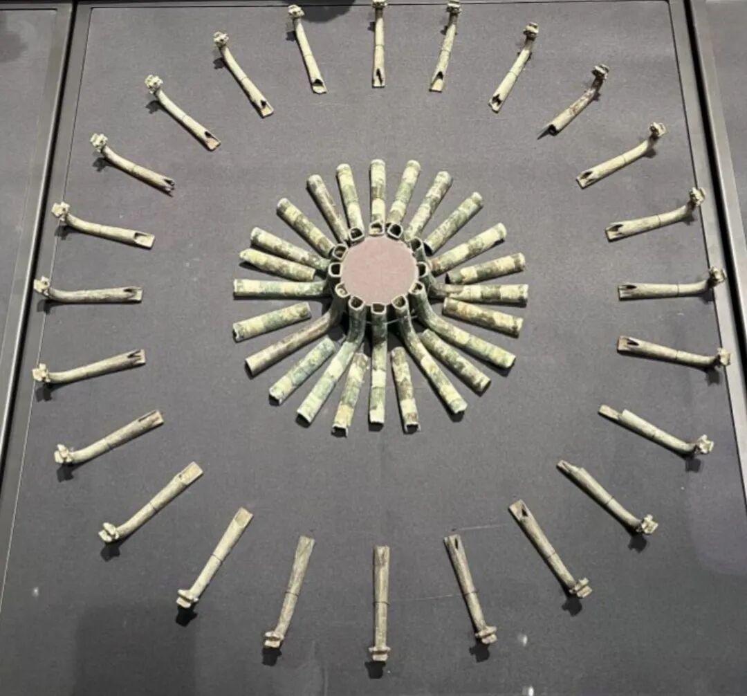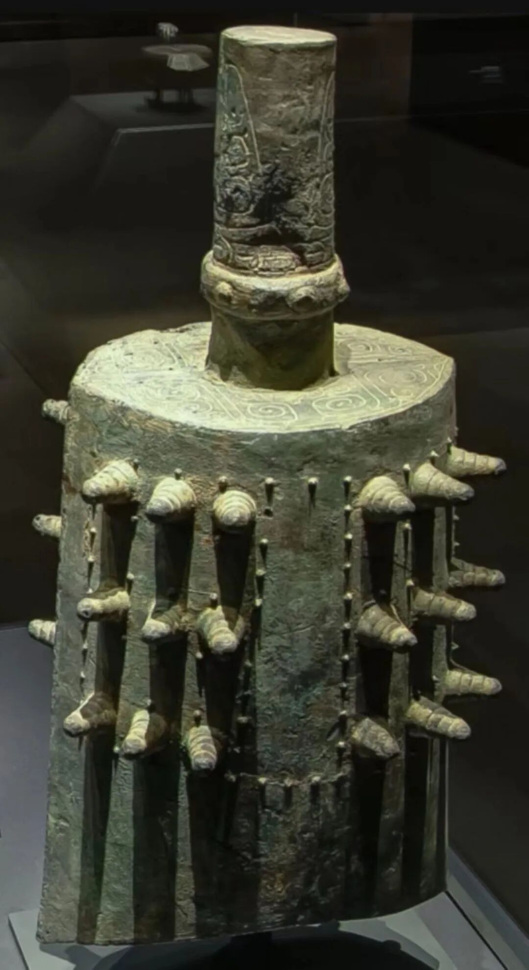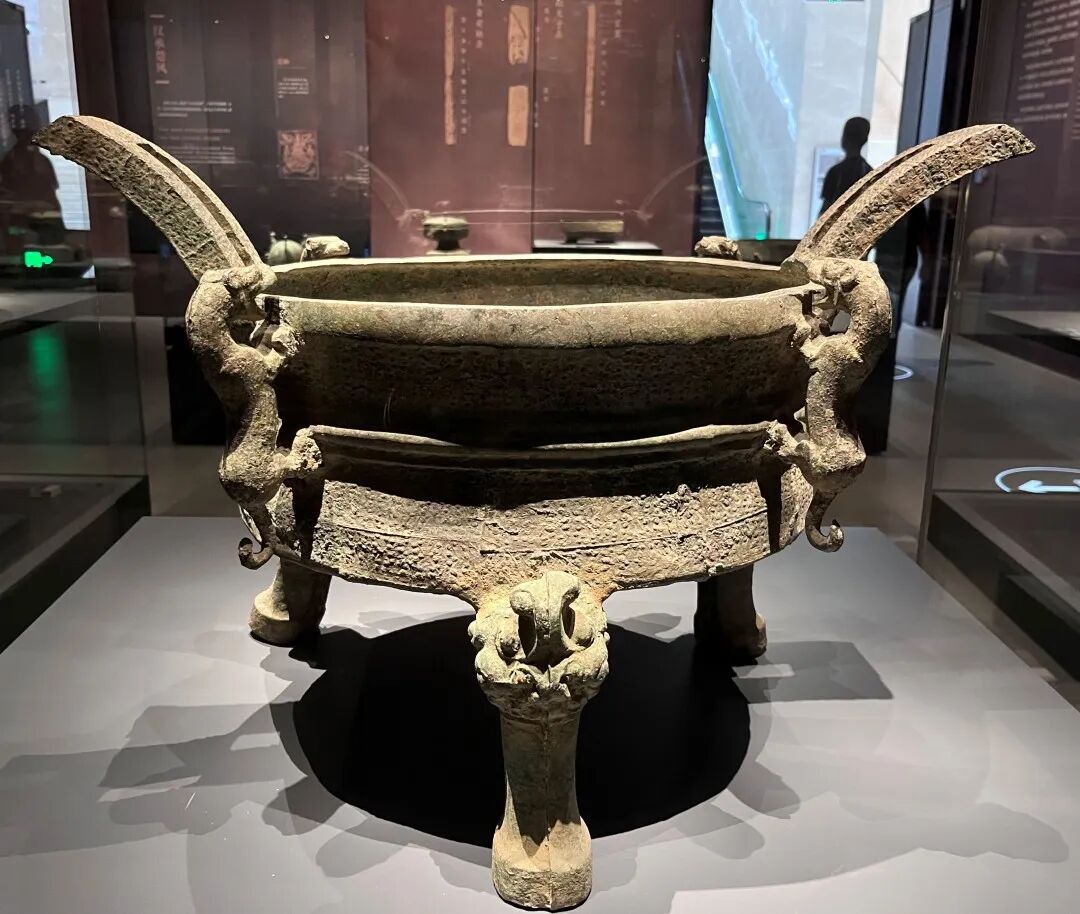 有意思的是,楚庄王问鼎虽然铩羽而归,几百年后,他的第十三代孙楚幽王熊悍倒是拥有了“九鼎”。不过这个九鼎并不是周天子所拥有的代表天下九州的九鼎,而是九件形制相同,大小递减的列鼎,其中的一件目前也是楚文化博物馆展出的重器之一。按《周礼》规定:天子用九鼎,诸侯用七鼎,大夫用五鼎,士用三鼎或一鼎。在当时,鼎是最重要的礼器之一,具有“别上下,明贵贱”的功能,通过鼎的组合和数量,可以看出其主人的身份地位。楚幽王位列诸侯,按礼制仅能用七鼎,怎么会有九鼎呢?