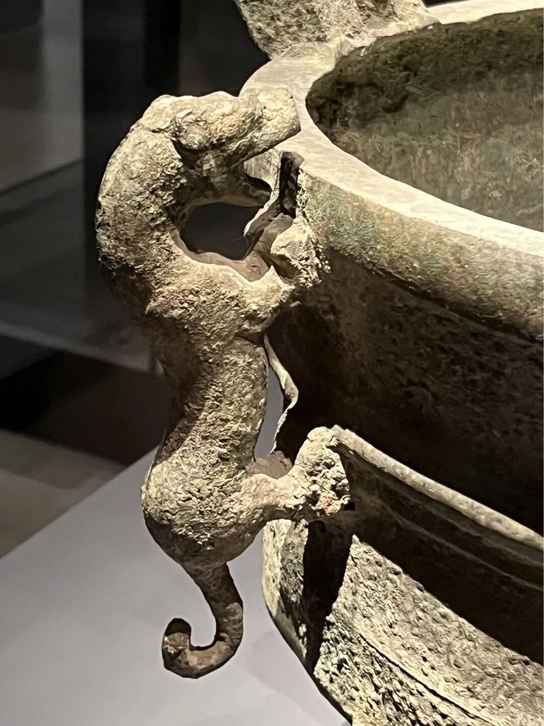 在楚文化博物馆的展厅中,还有一件十分精美的匜——重环纹三足铜匜。器型略呈葫芦瓢状,一端为外突的流口,对应一段置一龙首弓形鋬手,龙角竖起。有五道棱状弦纹和一道重环纹,龙形鋬手斜角云纹和重环纹。