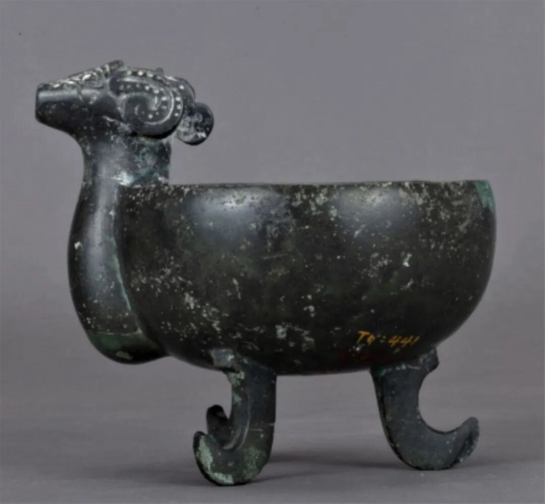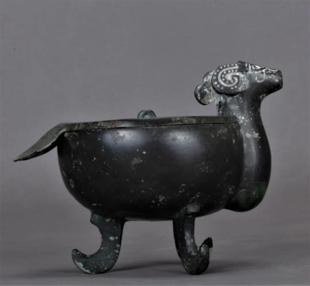 镇馆之宝三足羊首铜尊,是一件造型极为特殊的炊器。通体呈现光亮的铝黑色,整体造形似一只圆润小巧、灵动古朴的温顺绵羊;器身油亮光润,直口,圆腹,腹身的一侧向外凸出延伸至口沿上方,呈绵羊首状,绵羊面部耳、目、鼻、嘴及羊角以阳刻线条描摹,器底置有三个上翘钩状器足;扁平的器盖,正中间有一个桥形半圆钮,一端有弧形缺口,用以直接卡入羊颈,另一端呈扇形下斜象征羊尾,其上装饰有勾连云雷纹;整件器物小巧玲珑,造型独特,形态生动。这件器物通高 11 厘米,口径 9.2 厘米,与通高 113 厘米、口径 87 厘米、“里面能煮头牛”的楚大鼎相比,极为小巧精致。从目前出土同一时期器物来看,其形制独一无二,可谓是旷古无两。而“羊”与“祥”通假,这也是一件富含吉祥寓意的器皿。