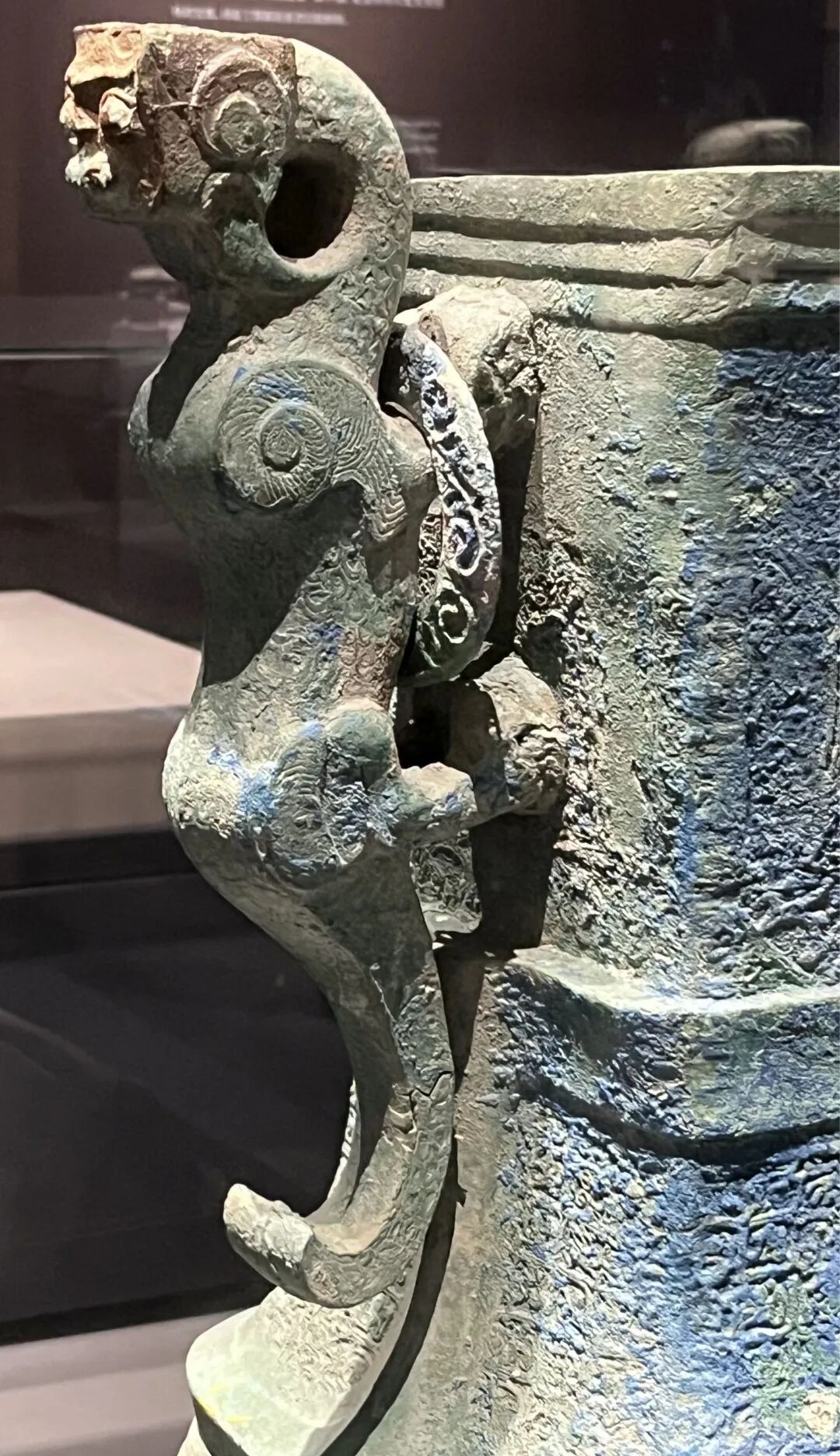 楚人善饮,连“罍”都要拿来炸了,自然还需要更大的酒器来盛酒。在楚文化博物馆,同样还展出有另一种巨型酒器:蟠虺纹兽耳铜方壶。该方壶通高 69 厘米,腹围 94.2 厘米,口宽长 18.5 厘米,底宽长 23.5 厘米。该壶颈部两侧置一对兽形耳,兽首向外,作爬行状,仿佛问到酒香味,也要一探究竟。前足各衔套一环,环上饰斜角云纹,兽身和四足分别饰鳞纹和细毛纹。