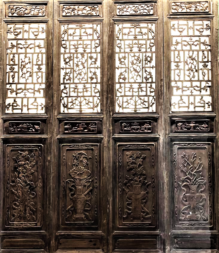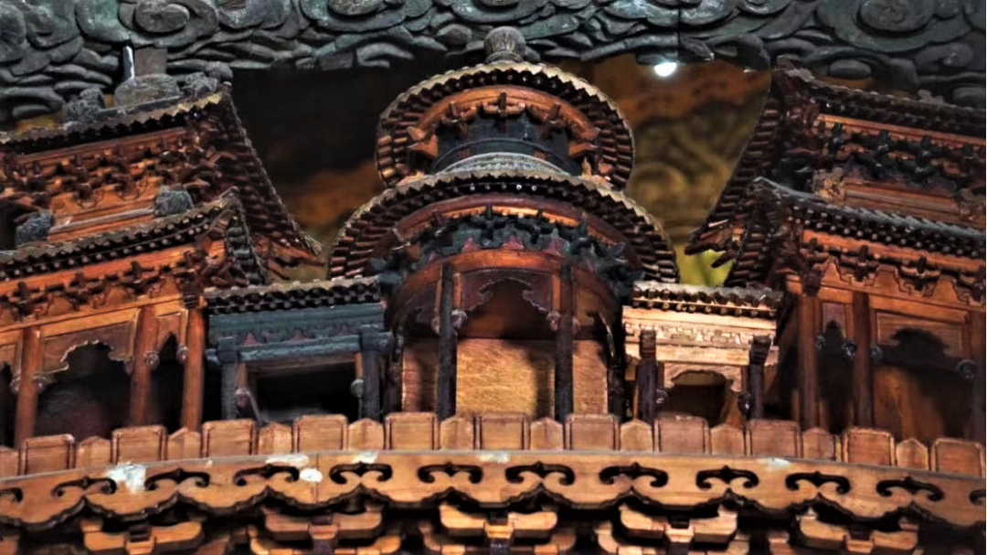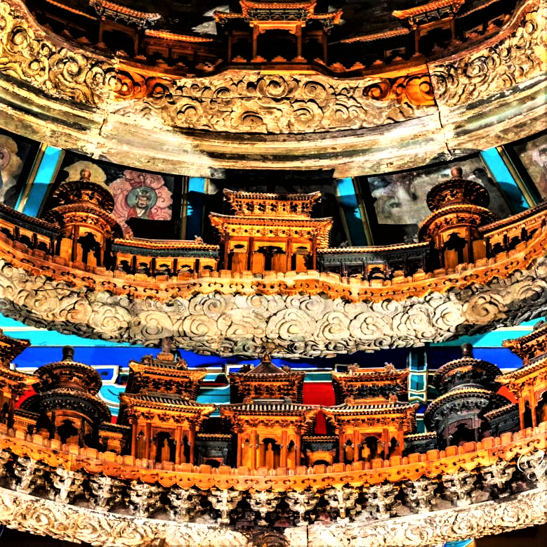 这是个外圆内方的藻井,向上隆起6层。它的精致到了“井身无处不雕刻,每层无层不精彩”的地步。藻井每层均细雕云纹图案,同时又采用圆雕的形式,雕琢了精致华丽的亭台楼阁。其建筑样式十分丰富,仅屋面形式就有重檐歇山、重檐十字歇山、重檐圆攒尖、四角攒尖等。68座建筑均由廊贯通,或平廊,或爬山廊,而各廊制作手法又有不同,如爬山廊大斗直接坐在柱头上,不用普柏枋,属早期木构规制。建筑的排列组合方式为下层密集,越往上层数量越少,同时在各建筑及廊内置放神像,从下仰望,如神仙境界一般的空中楼阁好似近在眼前。