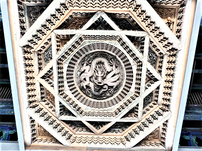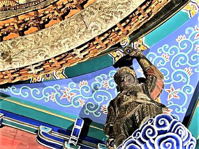 正觉殿明间藻井木雕四大天王单手擎天局部
