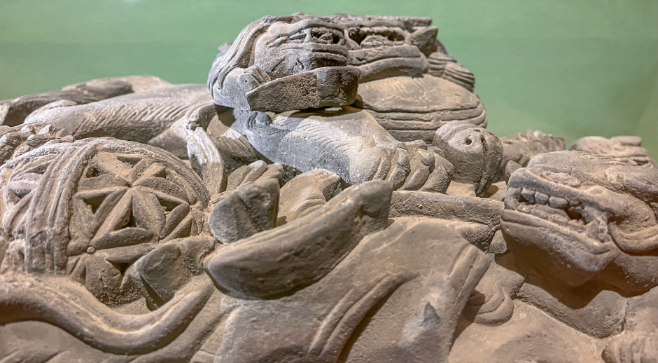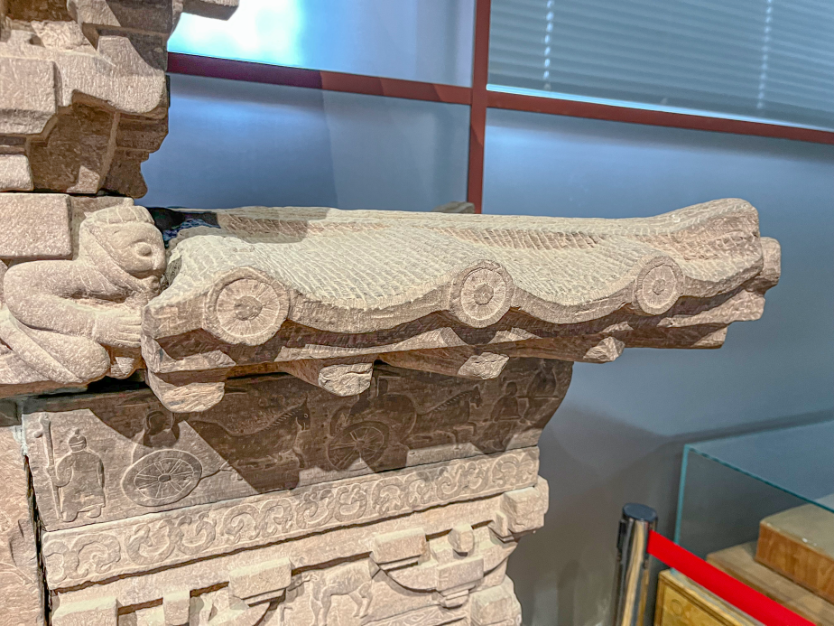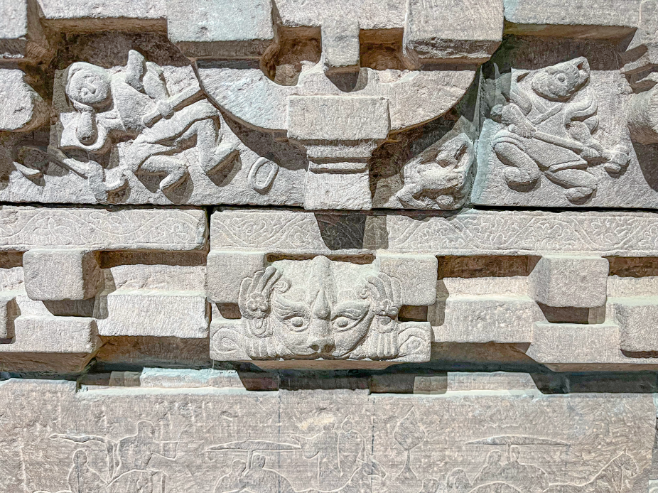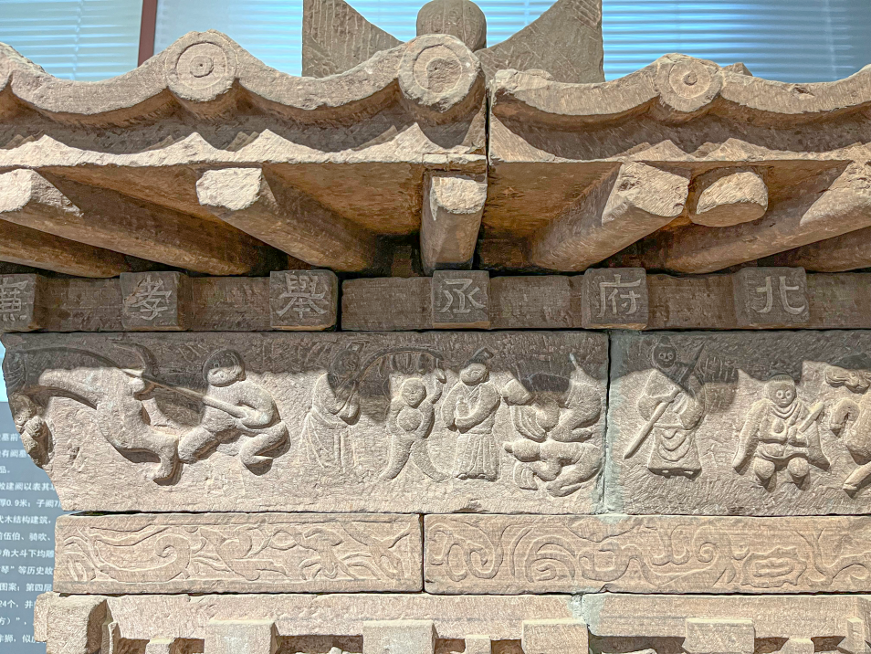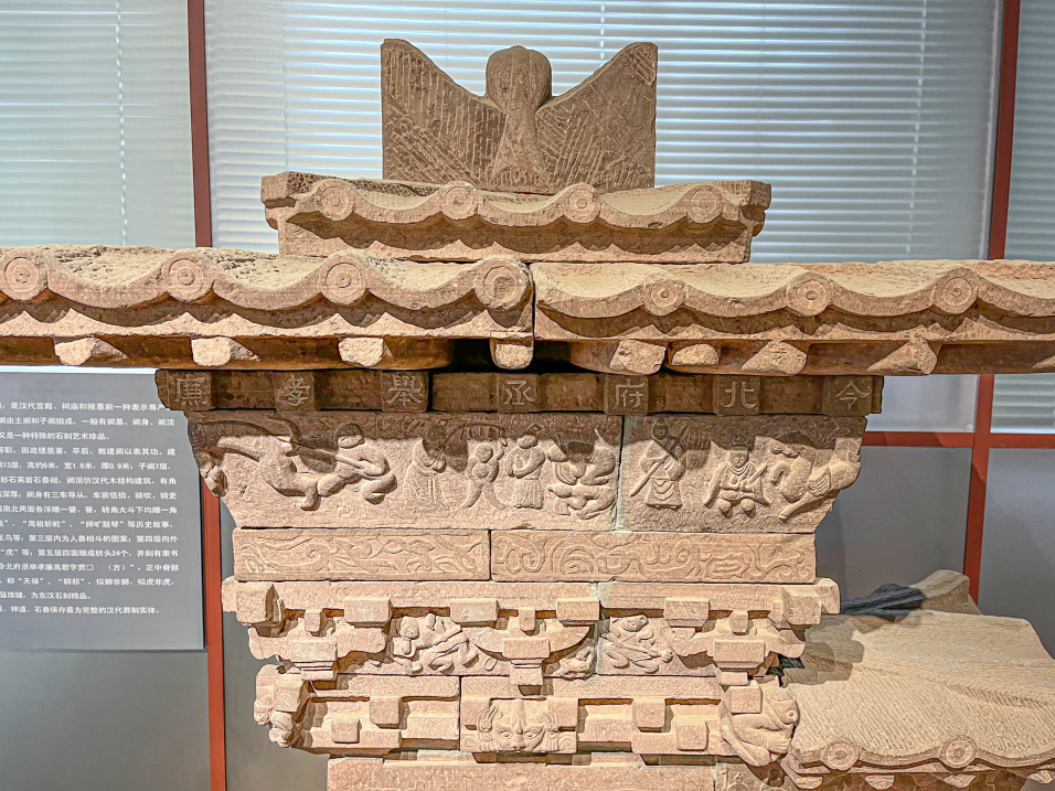 我们把目光聚焦馆中的这尊石阙:高颐阙(原件现存四川雅安)。顾名思义,高颐阙即为高颐所建。史料记载,高颐者姓高名颐字贯方,曾任东汉四川益州太守。墓前立阙,是始于汉代朝律,规定年俸 2000 石以上的官员死后可以建阙。高颐正属于这个级别的官员(相当于现在的正厅级官员),所以公元 209 年高颐辞世后,皇帝诏令为其建阙以示纪念。现存东西两阙,西阙保存完整,馆里陈展的即是西阙的复制品。