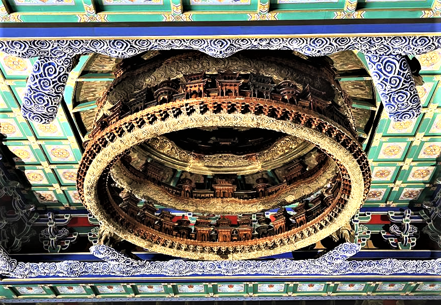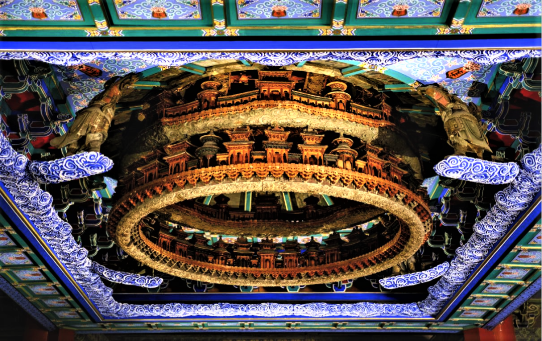 藻井原来悬挂于隆福寺的万善正觉殿明间,它的下方矗立的是一尊释迦牟尼佛像。从正下方仰视,藻井呈现内方外圆,这在佛界称为坛城,第五层的方形框架之上开了四道门,均为金银贵寿的福门,可称为佛教的神圣境界。如果从侧面看藻井,定是须弥山无疑。佛界有三千世界之说,小、中、大各一千,须弥山则是世界的中心。眼前是虚幻又真实的须弥山,彷佛触手可得。闭上双眼,双手合十,顿时有种漂浮的感觉,灯光一照,星河闪耀,仿佛时空轮转,令人目眩神迷。这种独具匠心的设计让人拍案叫绝!
