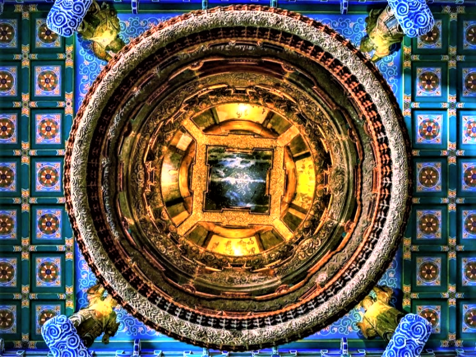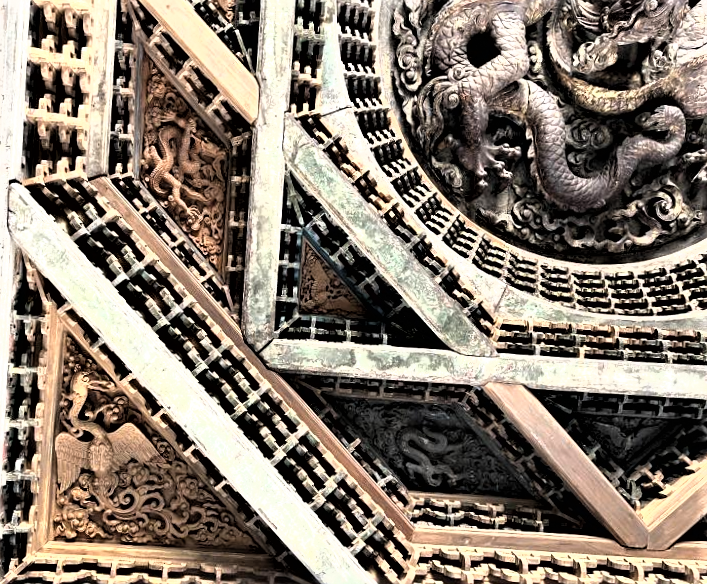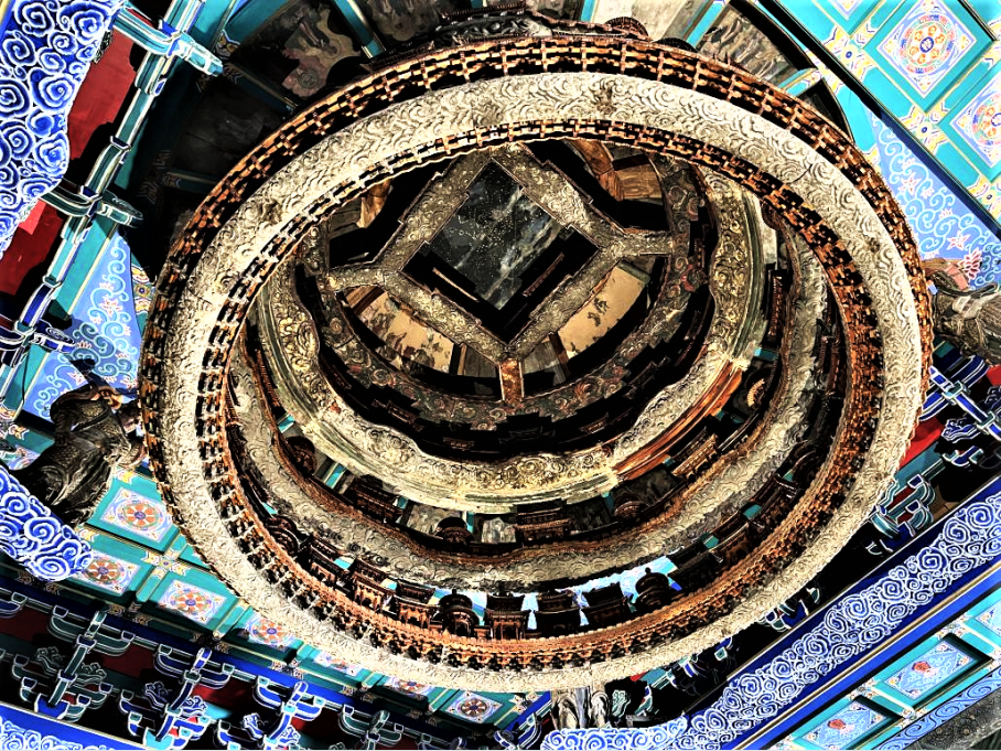 皇家宫殿御座之上,庙宇佛堂神佛像座之上,将穹顶向上凹进如井状,四壁饰有藻饰花纹,为的是突出主体空间,这就是“藻井”。谈到藻井,或许很多人都会想到我们生活所用的地下取水井。而藻井的位置与此恰恰相反,它是古代建筑室内顶棚的独特装饰部分。“藻”即水藻,代表水;“井”为天文中所称的“东井”,为贮水之所,因此藻井蕴含着古人避火的美好祈愿,同时也是传统建筑等级的一种体现。随着建筑技艺的不断提高,藻井结构日趋繁复,雕刻日益富丽精巧,极具观赏性。