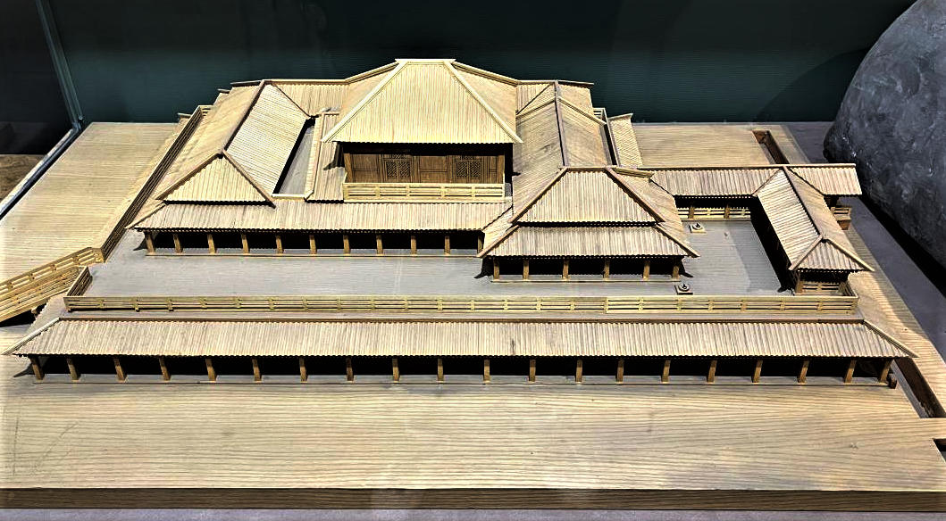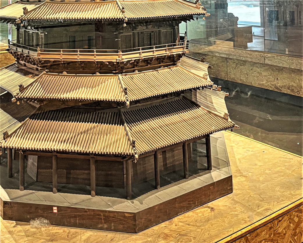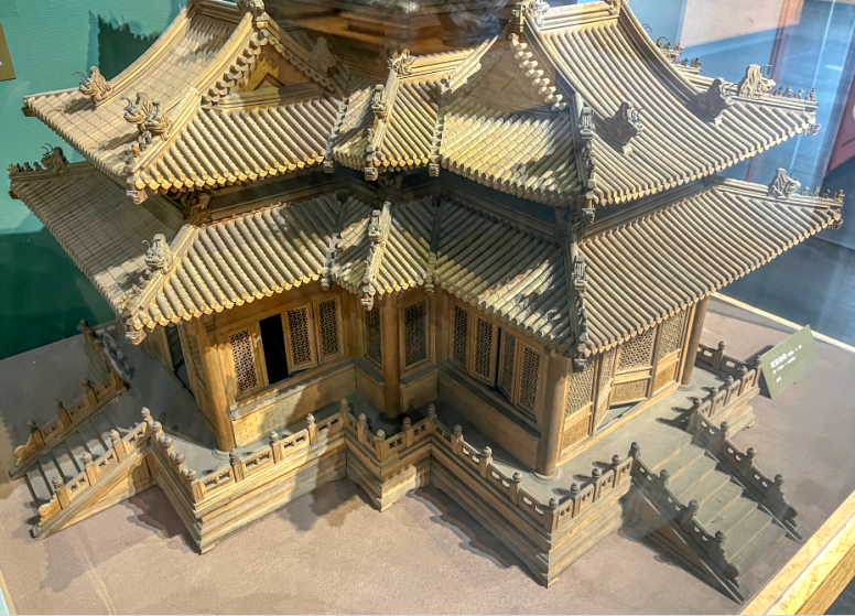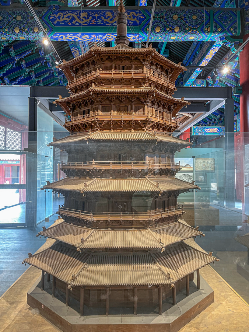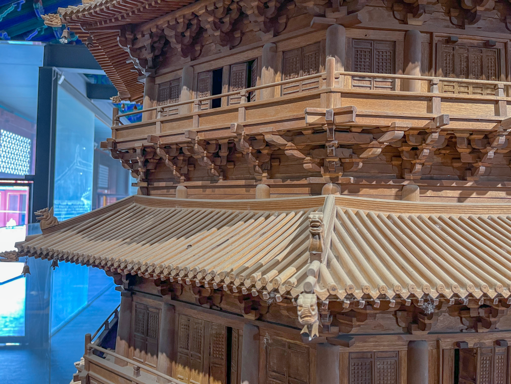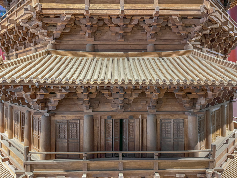 辽代在建筑中使用了“减柱法”,又称“移柱法”,通过受力的科学测算和设计,减少屋内的立柱或移动位置,使室内的空间更加开阔,采光更好。宋代李诫编著的《营造法式》(我国有史以来第一部建筑著书)已经将“减柱法”收录其中。展馆内展示的这座塔模是建于公元 1056 年的山西佛宫寺释迦塔,俗称应县木塔。它是辽代继承和创新汉唐以来传统模式建造的,是文化相融的建筑精品。
