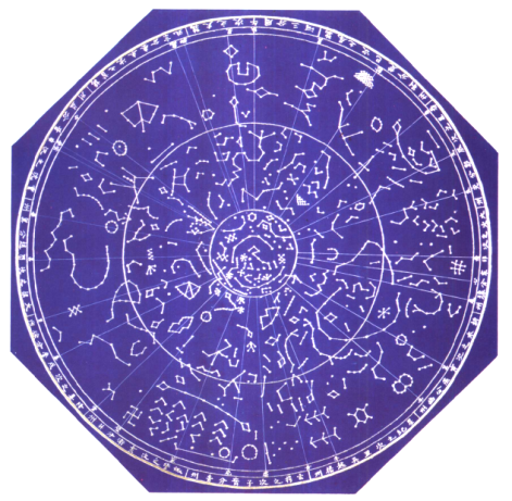 星图板为厚 4 厘米、边长 75.5 厘米的正八角形,在类似古星图中,这图幅相当大,仅次于杭州吴越古墓石刻星图。其表面裱以粗布为衬,并涂有深蓝色漆作为天空的背景,再在其上用沥粉堆金手法描绘出星象来,星星之间由金线相连,星象和文字不仅准确工整且完美传神,并有八谷、造父等星座的象形联法等等,值得深入研究。
