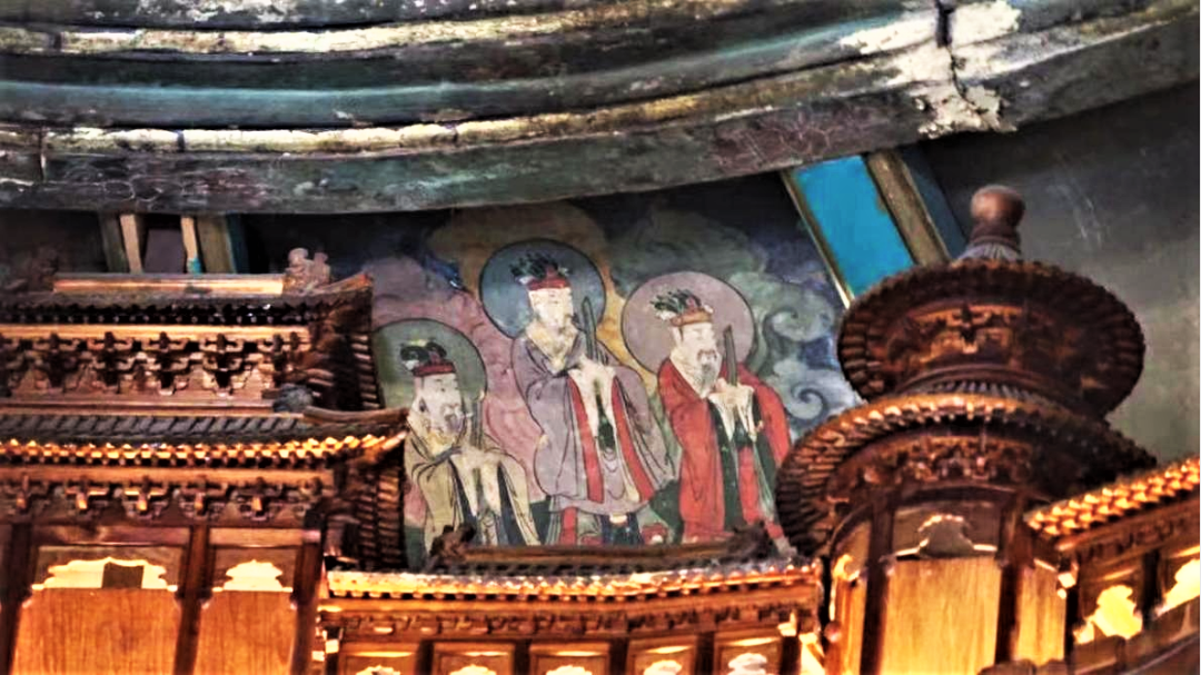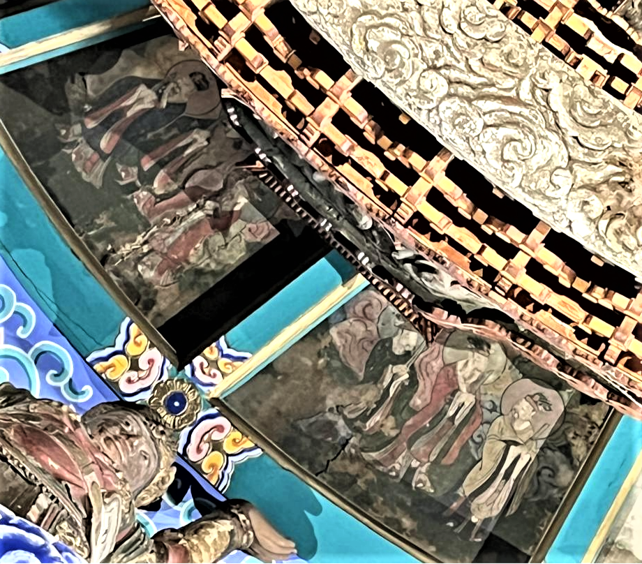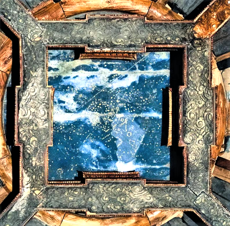 琼楼玉宇四周的画作是彩绘的二十八星宿神仙出行图,而这座藻井与其他藻井相比最特殊之处莫过于它顶部的星空图。一般藻井中心或浮雕或绘画,而以星空图作为顶部中心前所未闻,当世仅此一份。