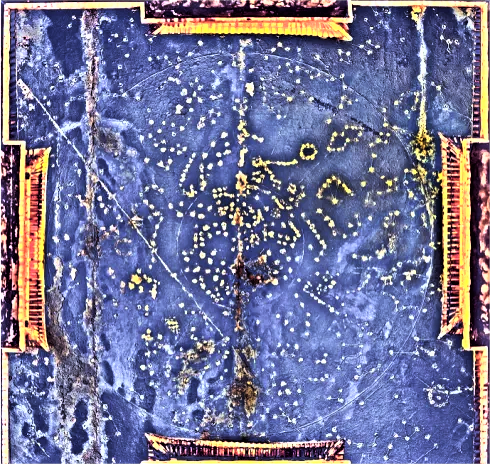 十分可惜的是,在寺庙长期香火熏燎下,天文图画面已变黑,星象难认。长期的雨水渗透和木板伸缩变形也使星图局部有剥蚀残损,好在沥粉形成的浮雕状凸起线条为临摹工作带来一些便利。描摹本是用薄纸覆盖原图板,以手抚摸突起的星点与线条描绘而成,从摹本中我们可以更清晰地对星图做出解读。