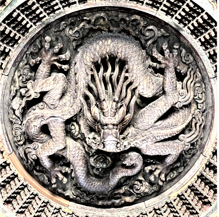 先农坛拜殿的这个藻井叫明镜,是当初悬挂在隆福寺毗卢殿殿顶的。作为一口方形藻井,里面又巧妙设计了八角形、三角形、菱形和圆形结构。藻井四角雕刻有翱翔的凤凰,周围的拱花簇拥着中心的蟠龙。整个藻井设计精美,雕工细腻,而最难能可贵的是,藻井通身为金丝楠木制成。井芯上的雕龙腾云驾雾,蓄势待发。龙的下垂姿态与这圆形明镜连成一体,同为金丝楠木雕刻,其工艺精湛,材质名贵,价值非凡,被称为“镇殿之宝”。