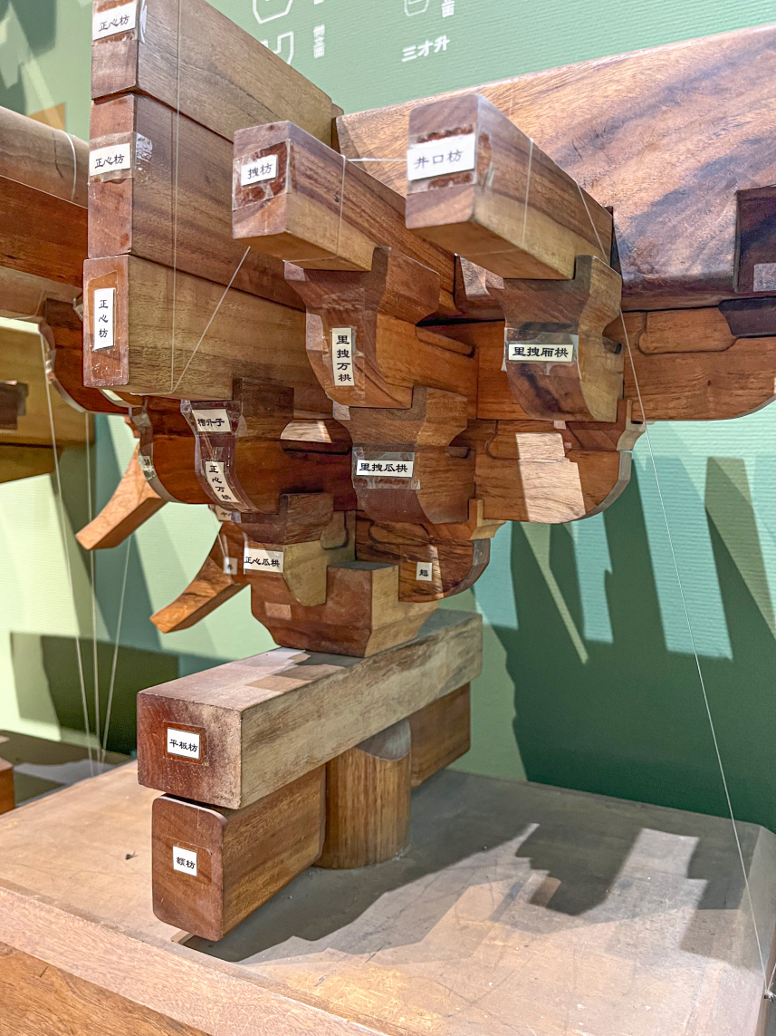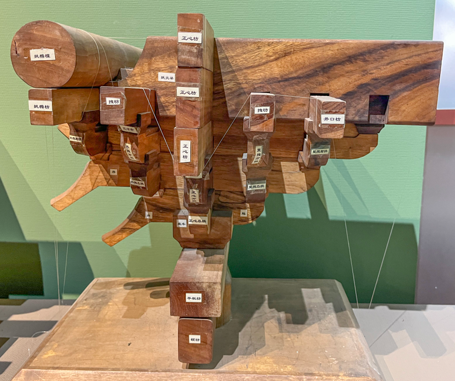 “斗”是方形木块,因形状似古代量米的斗而得名。“拱”是一种矩形截面的短枋木,外形略似弓而得名。两者经多重交叉组合形成“斗拱”。在《营造法式》中,斗拱被称为“铺作”。展馆中“中国古代建筑营造技艺”部分对斗拱有着详细介绍。