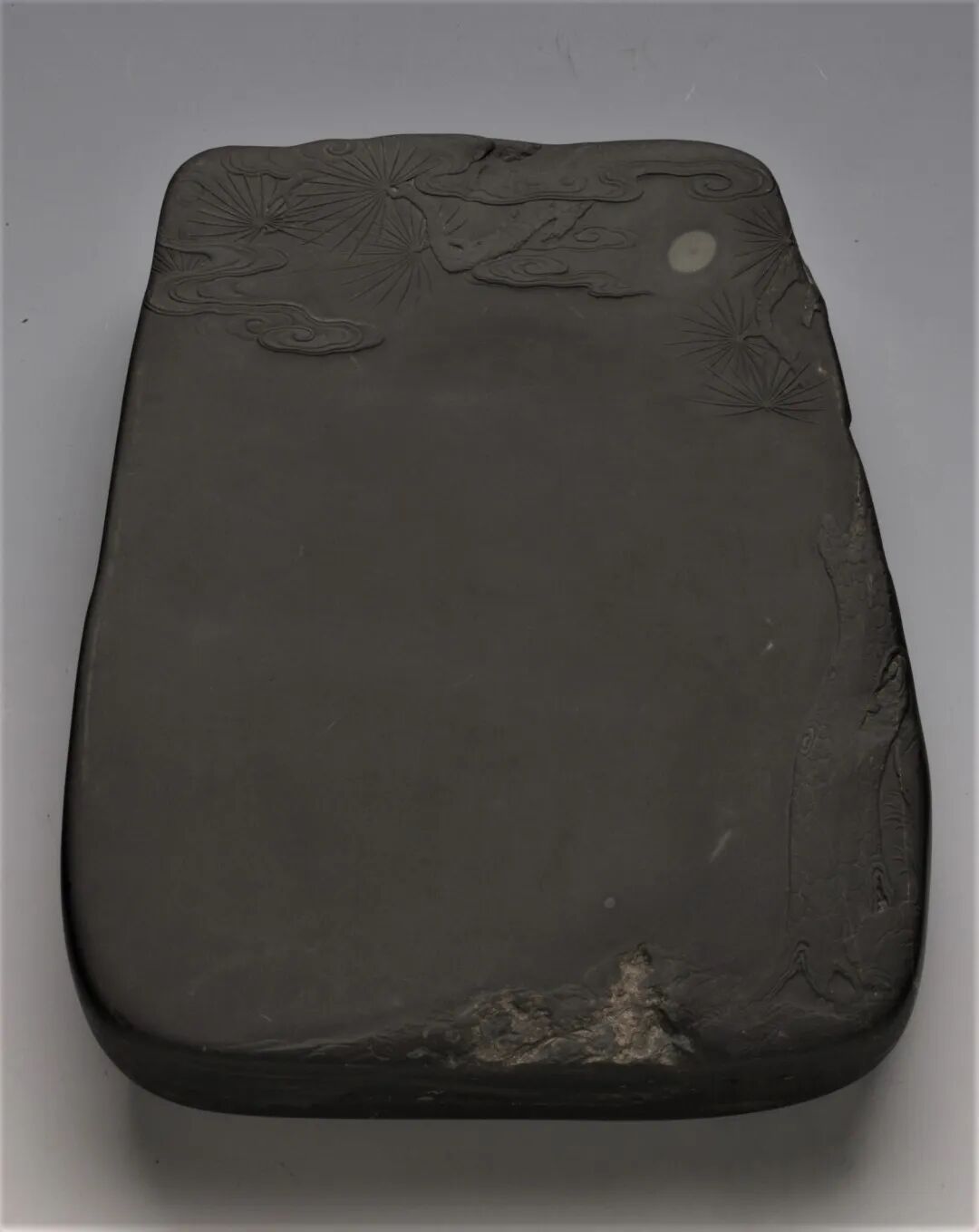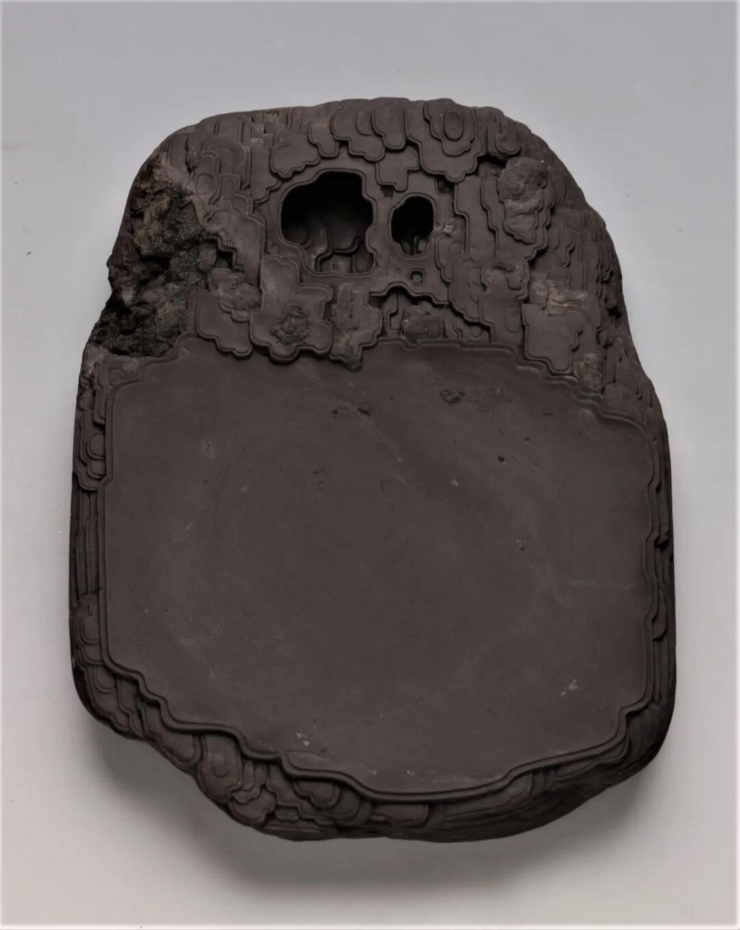 老坑石。石质致密坚实。有翡翠纹。雕工依砚材的自然形态,刻成山崖洞石之状。