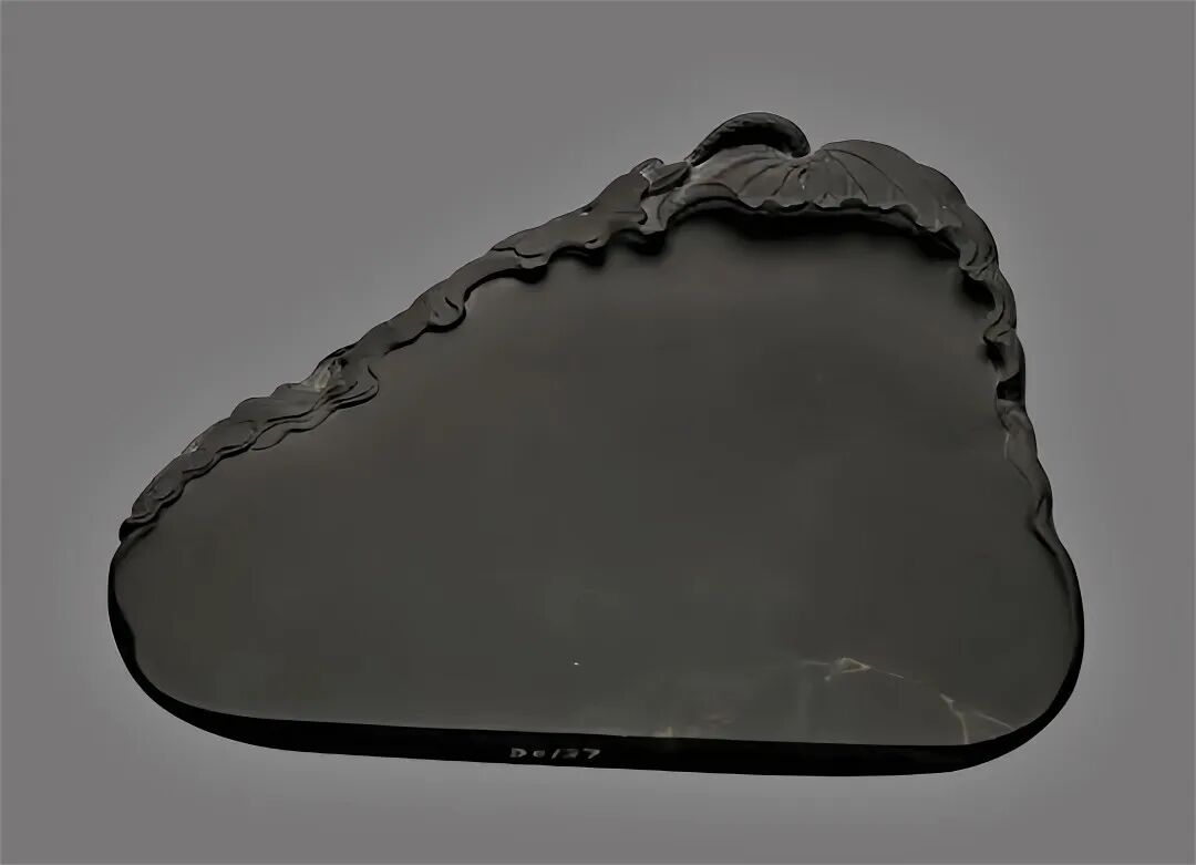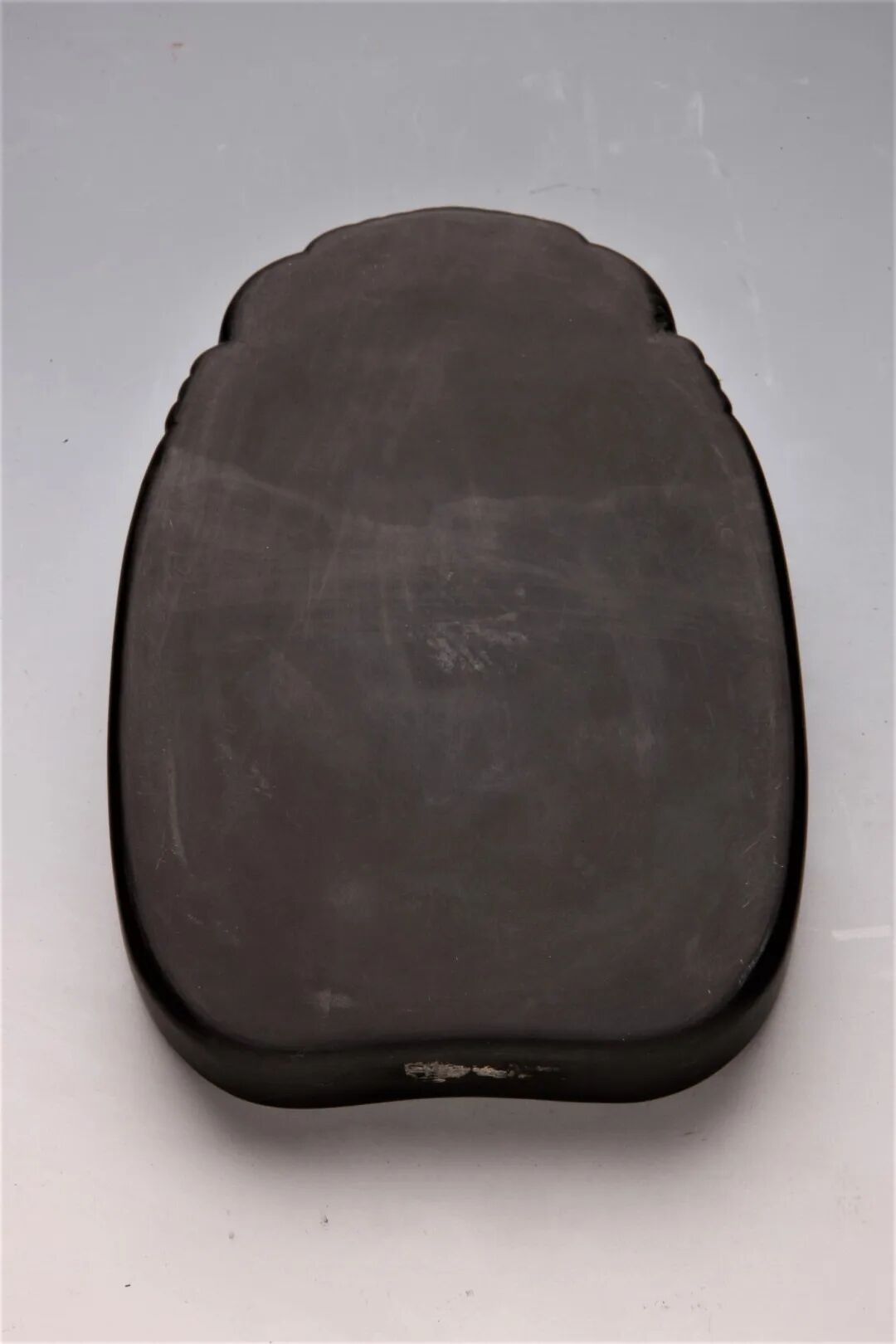 尺寸:长 12 cm 宽 15.5 cm 厚 1.7 cm老坑石。砚背过额雕饰荷花、荷叶。此砚石质石色石品皆优,或为“张坑石”。