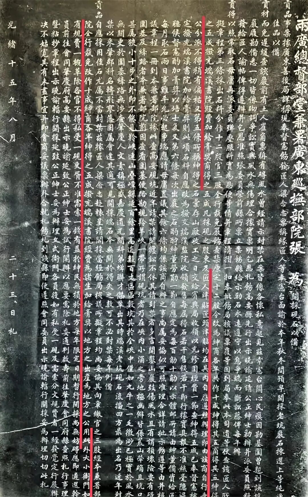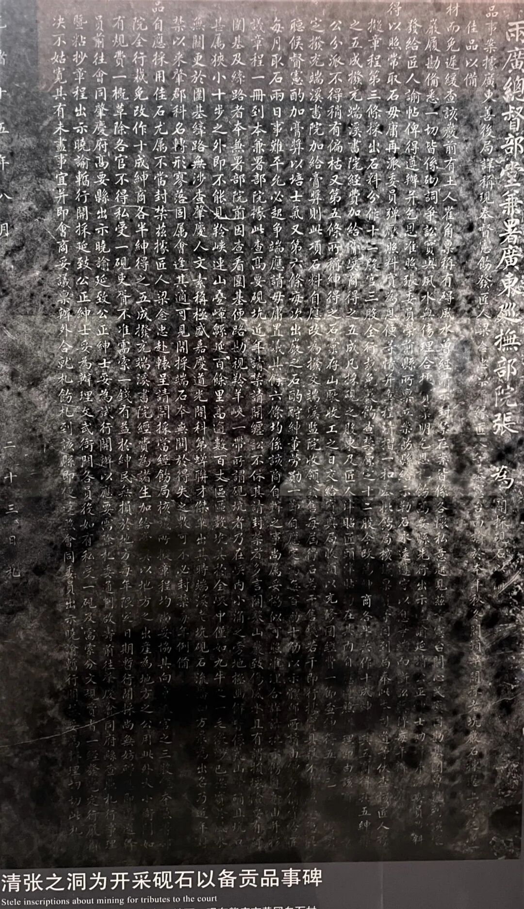 历史上曾数度封坑又数次重开。展厅里就有这样两块内容迥异的碑拓,一块内容是乾隆四十二年(1777 年),当地民众以影响灌溉、妨碍风水为理由,不准开采老坑而做的奉禁碑记。另一块的内容则是“张之洞为开采砚石以备贡品事碑”。这块碑刻于清光绪十五年(1889),时任两广总督兼广东巡抚的张之洞,平息了以有碍风水为名,不准开采砚石的争讼,解除封禁,核准石匠开采砚石,并申明将全部砚石开采利润的半数用于营建端溪书院(今广东肇庆中学前身,旧址在府城校区)。碑题“两广总督部堂兼署广东巡抚部院张,为开采砚石以备贡品事按”;落款为“光绪十五年八月二十三日札”。并明令各级官吏衙役不得敲诈勒索,私受一砚一钱。不过现已封坑,自上个世纪 90 年代末至今没有开采。