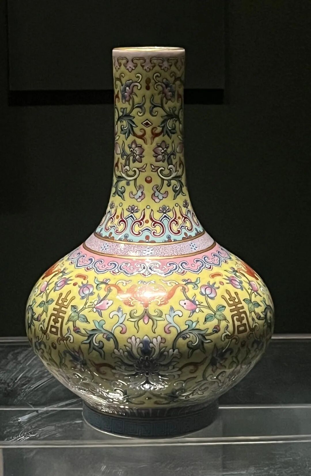 此瓶通体施黄釉,以粉彩为饰,外底施松石绿釉,矾红彩“大清嘉庆年制”六字三行篆书。腹部描金篆书寿字,又饰以蝠纹与缠枝莲纹,寓意福寿吉祥。