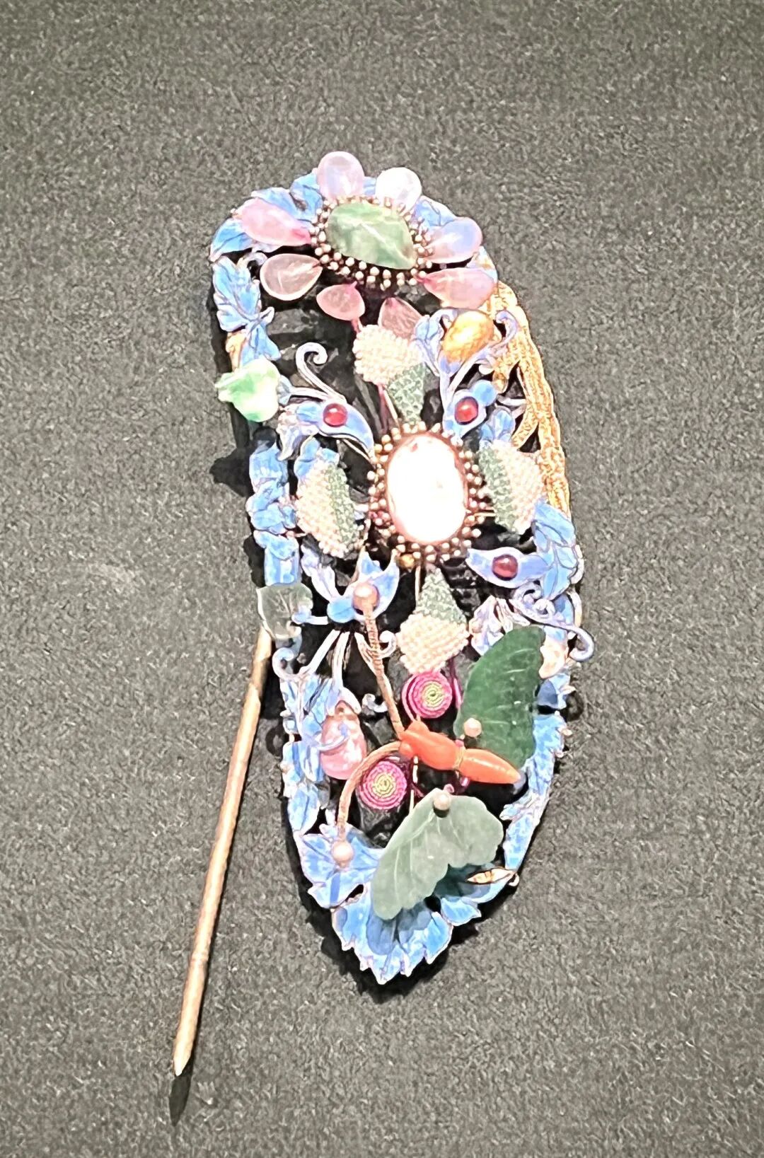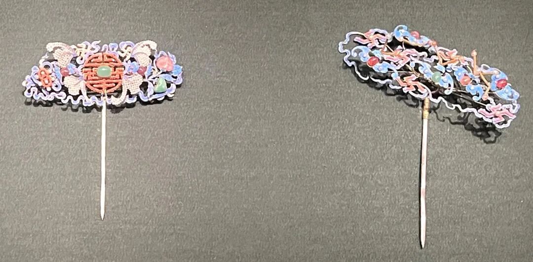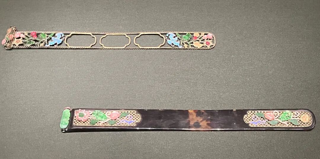 图中上面的扁方使用了翡翠、碧玺与翠羽,是晚清宫廷所喜爱的首饰风格。下面一件扁方则由玳瑁制呈,两端使用了花丝工艺铺地,上面镶嵌了翡翠、碧玺、珍珠等材料,拼出佛手、梅花、桃子等图案,做工讲究,为宫廷扁方精品。
