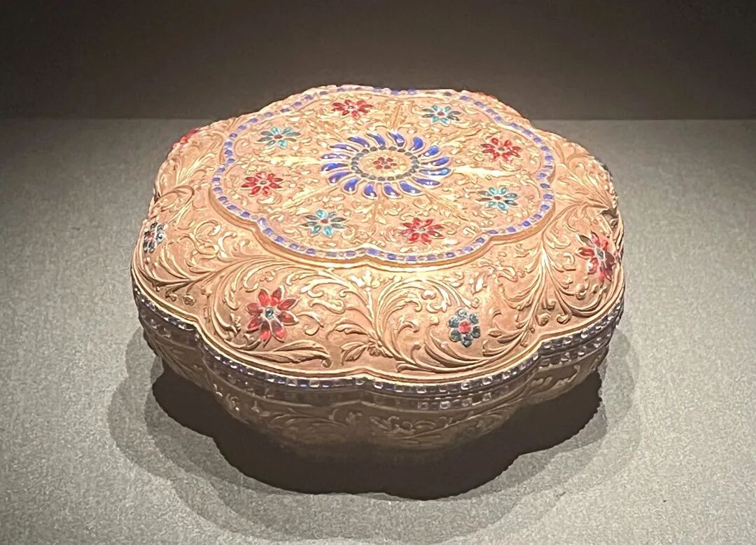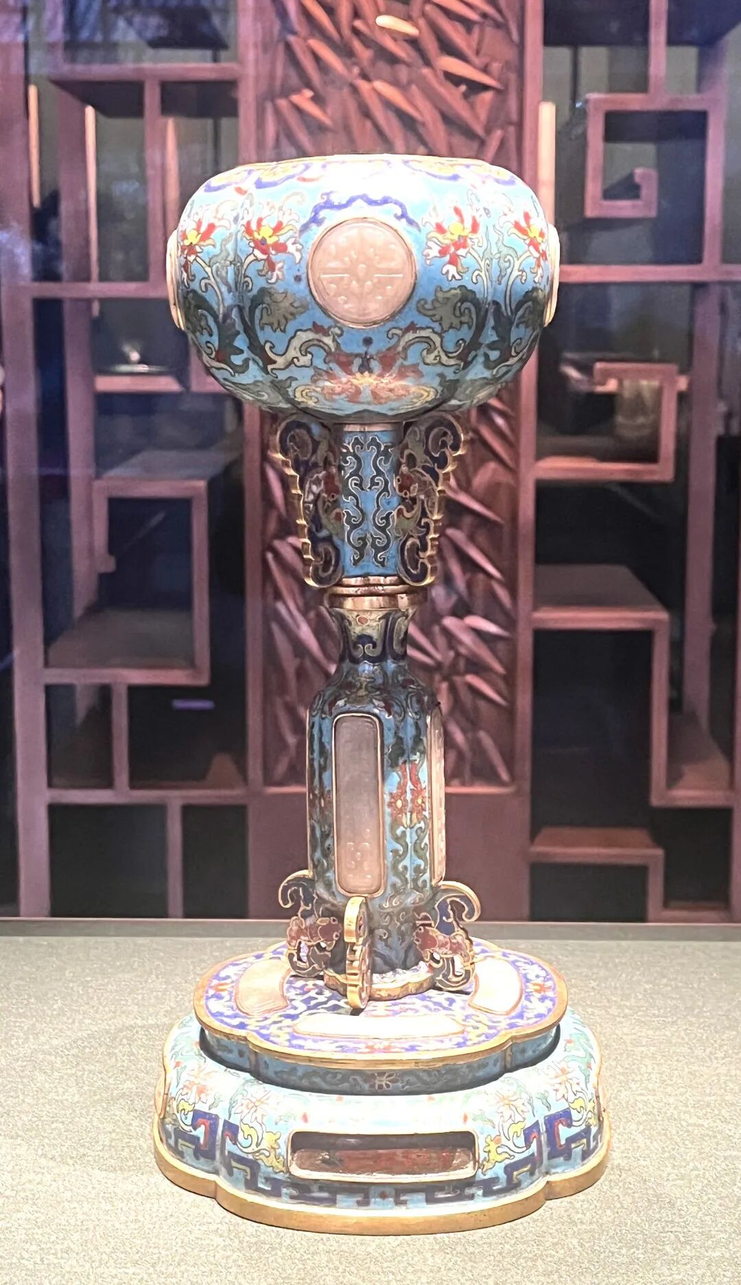 此件冠架为掐丝珐琅工艺,工艺繁复且造价不菲,冠架上还嵌有雕琢精美纹饰的玉片,是罕见的宫廷御用精品,使用的时候,会在顶部放入香料,用来香薰帽子。