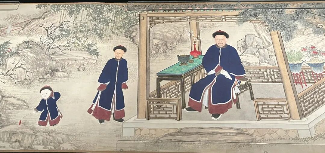 此幅作品中描绘的是嘉庆帝顒琰与皇子玩耍的情景。图中嘉庆悠闲坐于亭中,面容亲和的看向正在玩耍的皇子。此图既是嘉庆帝子嗣较少的真实写照,却也体现了皇家父子之间的温馨氛围。