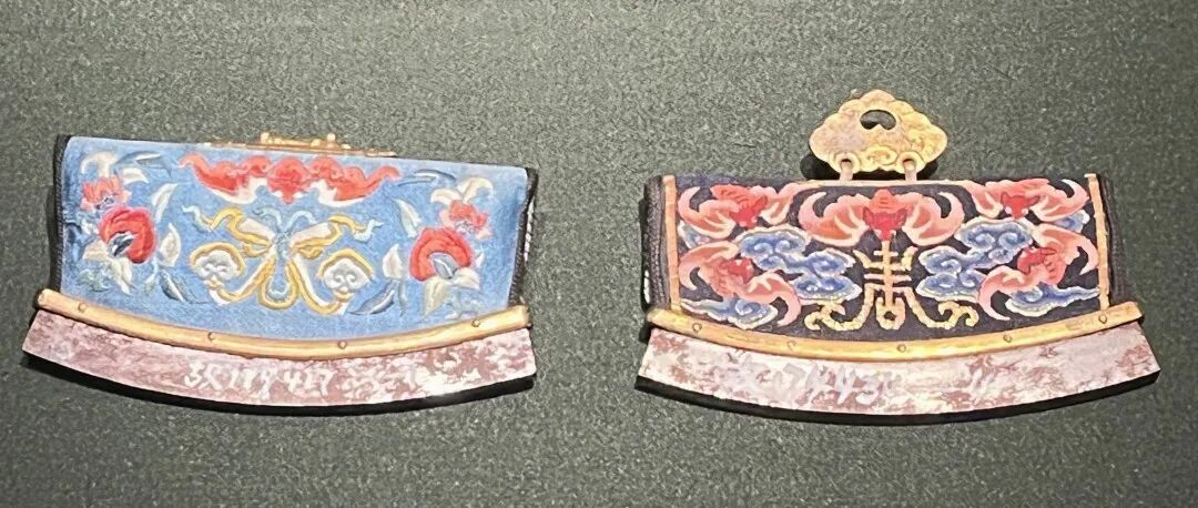 这两件火镰分别绣有蝙蝠纹、五蝠捧寿纹,样式精美,为宫廷之物,火镰袋中至今仍有当时为取火存放的火绒。