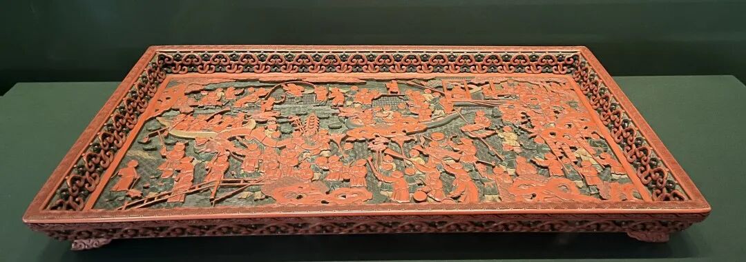 抓周这一习俗由来已久,流行于民间,在清宫亦有沿用。抓周所用器具根据家庭条件各有不同,一般人家多用铜茶盘,富户人家会陈设大案。这件剔彩百子晬盘是专为宫中的皇子、公主们抓周而特别制作的,盘底镌“大清乾隆年製”和“百子睟盤”楷书铭。此盘采用了漆雕工艺,色彩典雅,代表了清代剔彩的超高水平,盘中雕婴戏图一幅,场面极其热闹,人物形态各臻其妙,鲜洁明快。