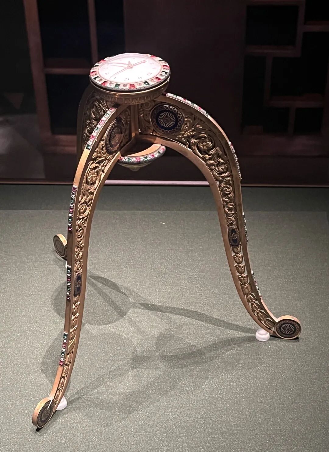 此件冠架被巧妙的设计成了可折合式,比一般冠架更加方便收纳,且冠架顶端的冠伞部分以表为装饰,周围嵌有彩色料石,更给冠架增添了装饰作用。冠架设计巧妙、做工精致,是清宫生活用具中的精品。
