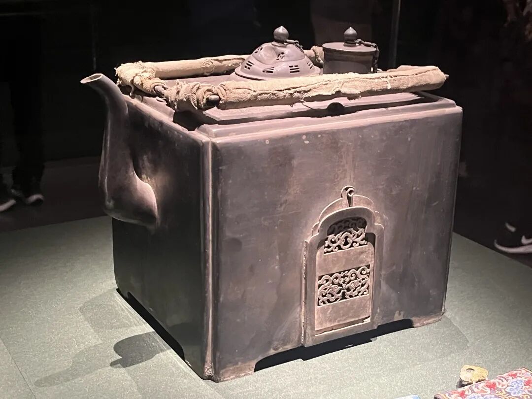 暖壶就是现在常说的暖水瓶,这件清朝时的暖壶为银质,分为两部分,一为加热装置,位于壶的中间,一为盛水装置,围绕在加热装置的四周。壶的上部有两个开口,一个为圆形,放入木炭以实现加热功能,顶部另一小口为注水口,在侧面亦有一个开窗。整体设置既安全又实用。