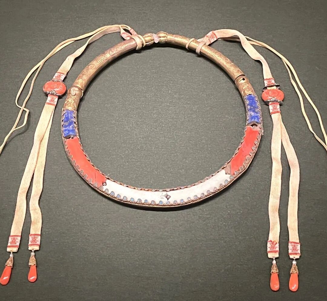项圈是清代后宫女眷朝服的配套饰物之一,也称“领约”。大致为一个镂金的圆环形状,有开合式的活口,环上镶嵌宝石,活口处垂下两条绦。使用时打开金圈,由项间套入,丝绦垂于背后,上至后妃下至命妇,行大礼时用之。