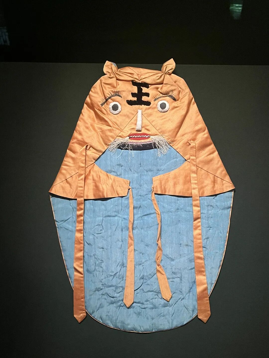 与民间蓝、粉红布料不同,这件虎头帽以具有皇家特色的杏黄缎制成,衬月白色绸里,内絮棉花,外观似小披风,用料精细,较之民间虎头小帽更为上乘。其原主应是清宫中的皇室儿童,与一百余件儿童衣物、帽子、鞋子存放于玄穹宝殿之中。