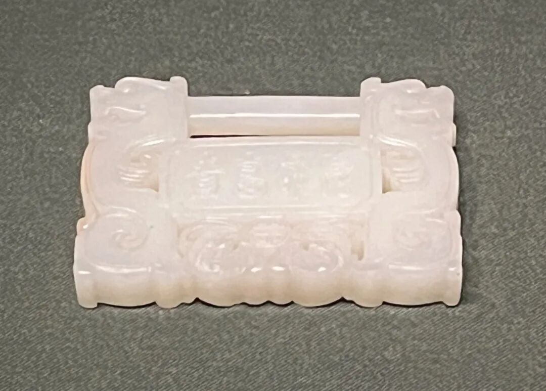 “扁方”为满族妇女打扮旗头时使用的横向扁长簪,是满族妇女梳两把头时的主要首饰。载涛、郓宝惠两人在《清末贵族之生活》一文中写道:“满族女子平时梳两把头,式样简朴。皆以真发挽玉或翠之横扁方之上。”扁方一般呈尺形,一端半圆,另一端似卷轴。扁方如横簪,其作用类似汉族男子束发用的长簪,起到连接真、假发髻之中“梁”的作用。一般质地多为白玉、青玉,少数为金、银制品。