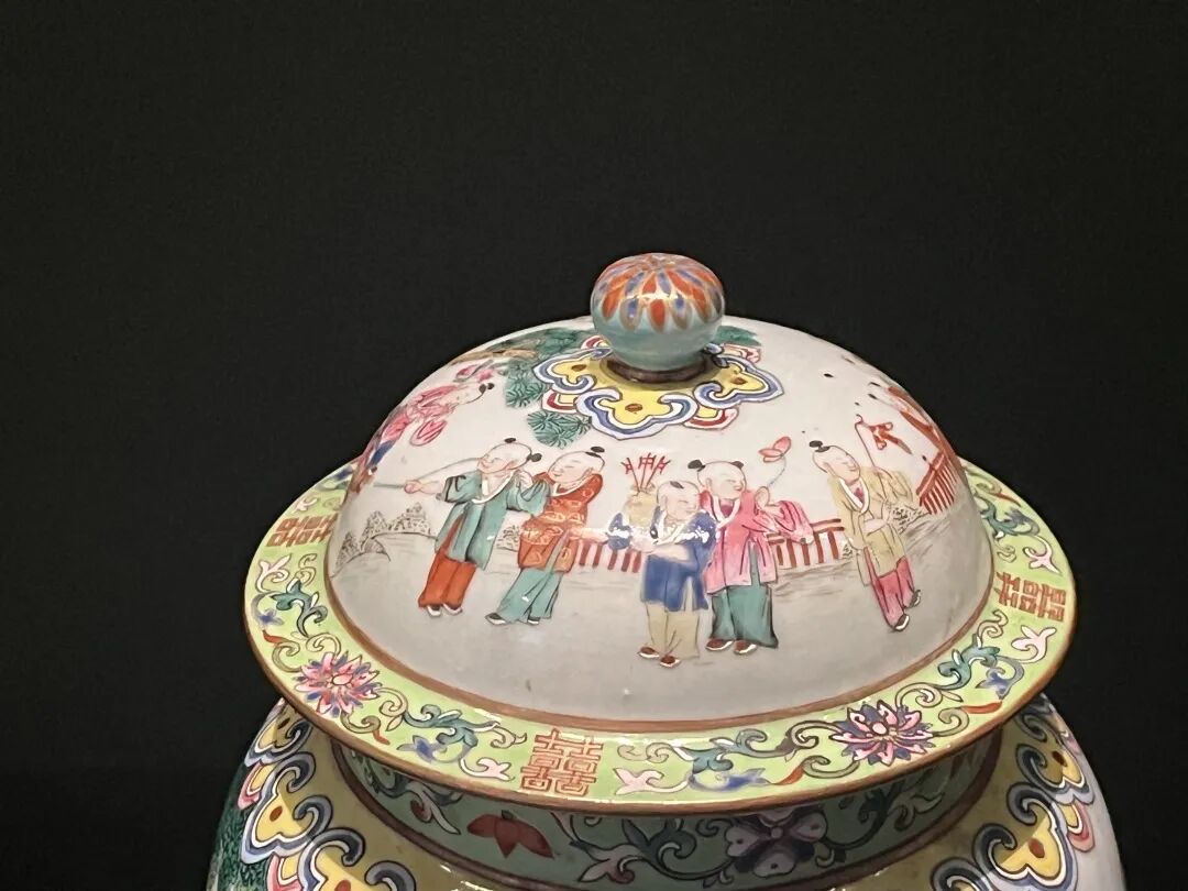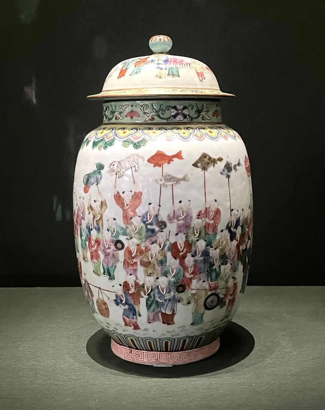 此罐通体描绘百位孩童舞狮、戏龙、放鞭炮等热闹场景,婴孩手持戟、罄等,谐音“吉庆”的吉祥寓意。