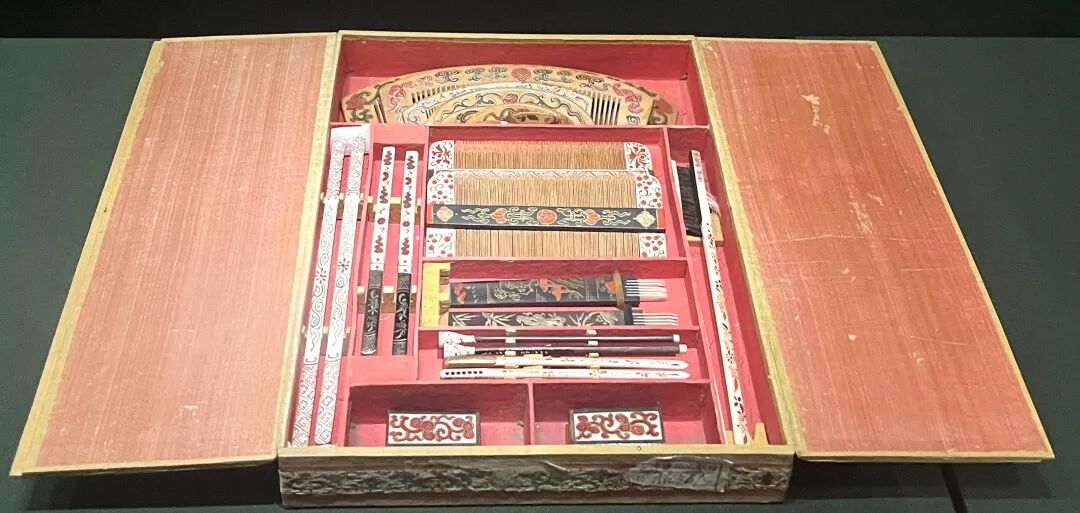 清朝后妃的日常梳妆极为讲究,梳头时先用大梳子大面积通发,再用密齿篦子篦去头皮上的污垢。然后用月牙形状、中等大小的梳子梳好髻和燕尾,最后再用寸许长的小梳子整理发梢鬓角。梳头的时候,还要用抿子沾上刨花水,边抿边梳,这才能梳好一次发髻。盒中的扁针则是在佩戴头花饰物时用来拨开头发,以免弄乱刚梳好的头发。