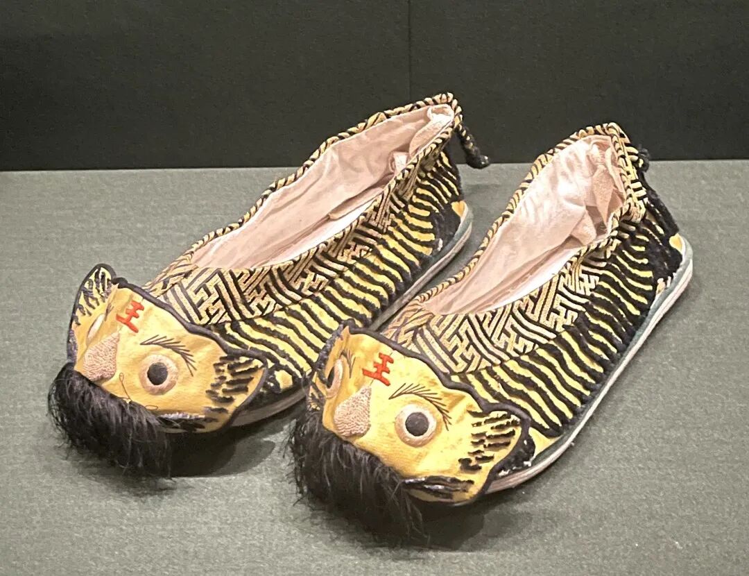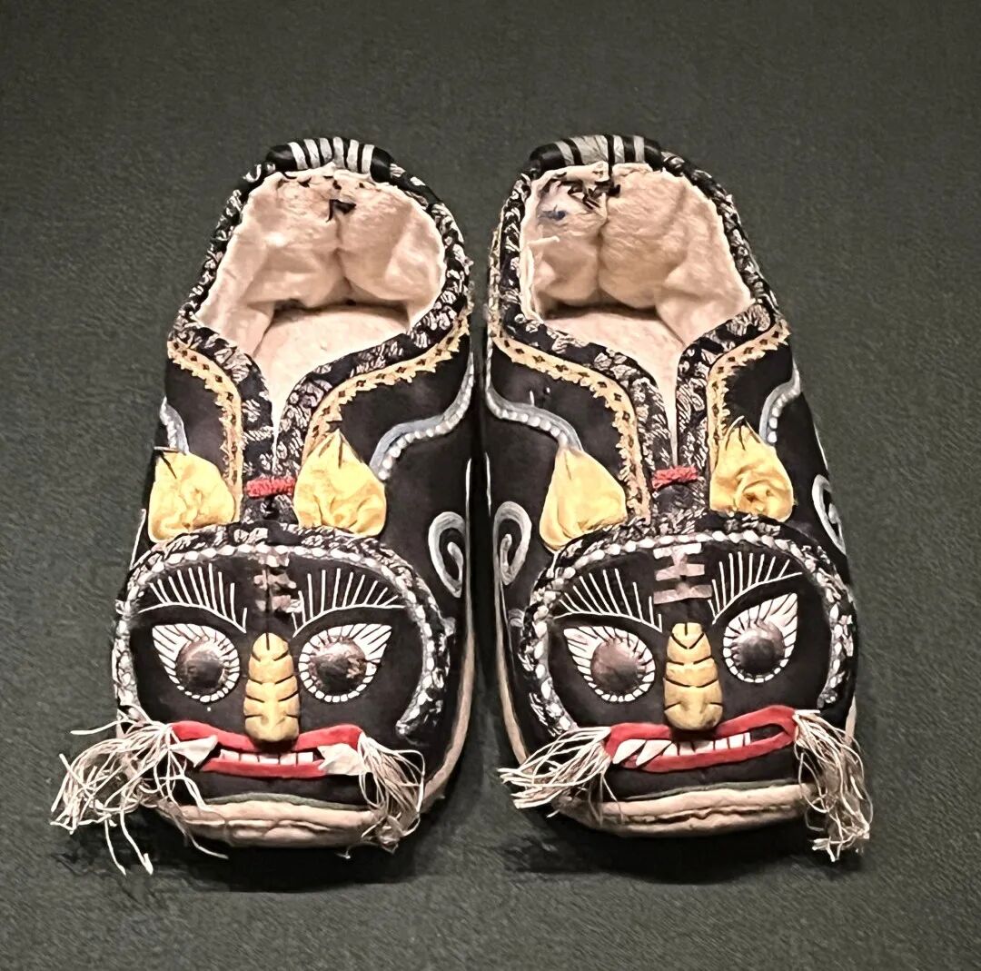此件虎头纹鞋是光绪时期物品,存放于养心殿体顺堂中的一个大箱中。据记录,箱子“内存各式鞋半箱”,大小不一,款式不同,但都品相完好,并无穿着痕迹,应是为未来的皇室儿童所做。
