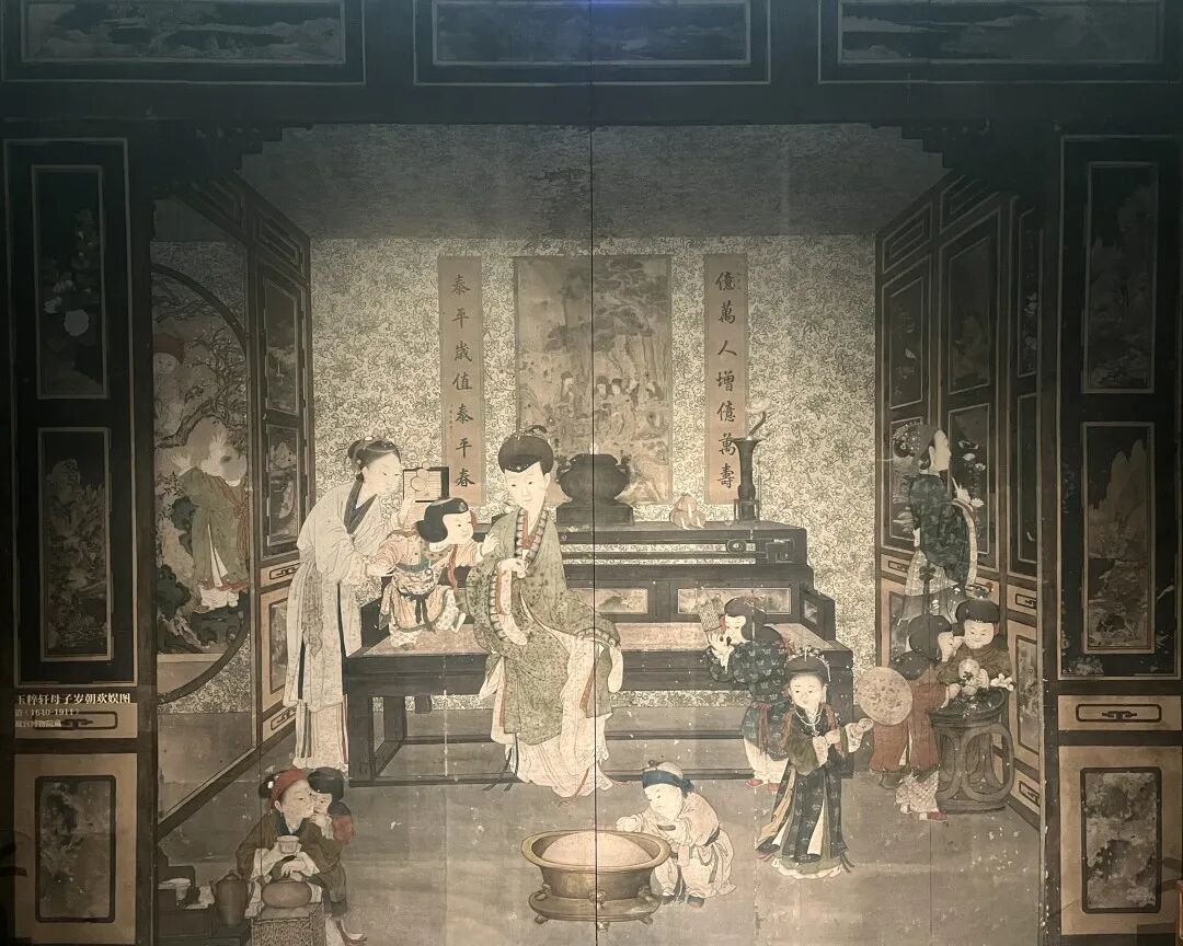 此图绘于乾隆时期,描绘了宫中过年时的生活场景。此图是一幅线法通景画,是专为玉粹轩所绘,即采用了透视的技法,将人物画面与宫殿实景相连,从而产生图中虚实相映的效果。万家团圆之际,宫中母子欢笑、其乐融融的场景,体现了宫廷新年的浓浓人情味。“亿万人增亿万寿,泰平岁值泰平春”,画中厅堂上所贴对联出自乾隆三十七年御制诗《元旦试笔》,蕴含着乾隆对皇室自家、对天下万家的新春祝福,祈求家国祥和,百姓安康。