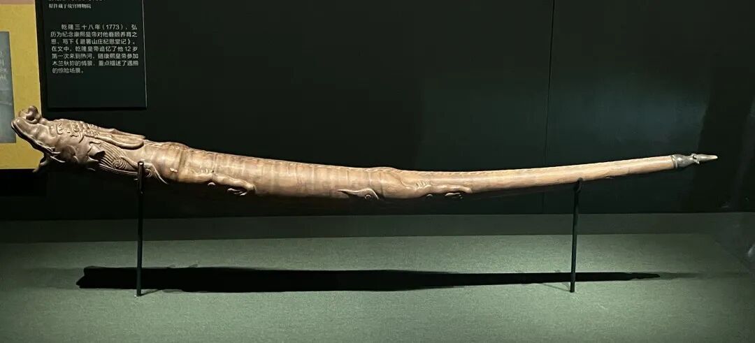 “马背上的民族”要求能文能武,皇子们要学习弯弓射箭。此鹿哨为皇帝狩猎之用,围猎时模拟鹿鸣诱鹿而出,近而矢射。清代皇帝木兰时,多令皇子随行,乾隆皇帝 12 岁时即随康熙皇帝木兰。此鹿哨为楠木所制,哨身雕龙,镶牛角嘴,做工精美大气,具有皇家风范。