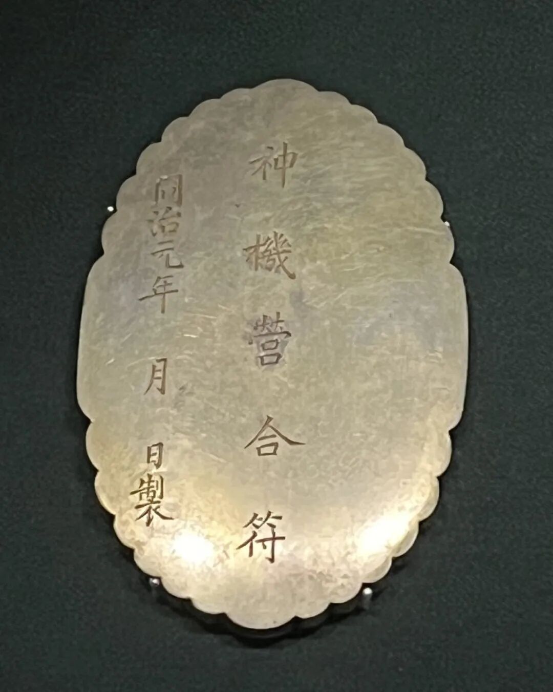 此神机营合符为椭圆形铜镀金质,一面刻阳文“圣旨”,另一面刻“神机营合符同治元年月日制”,合符制成后一分为二,作为信物供持有者双方相互印证。