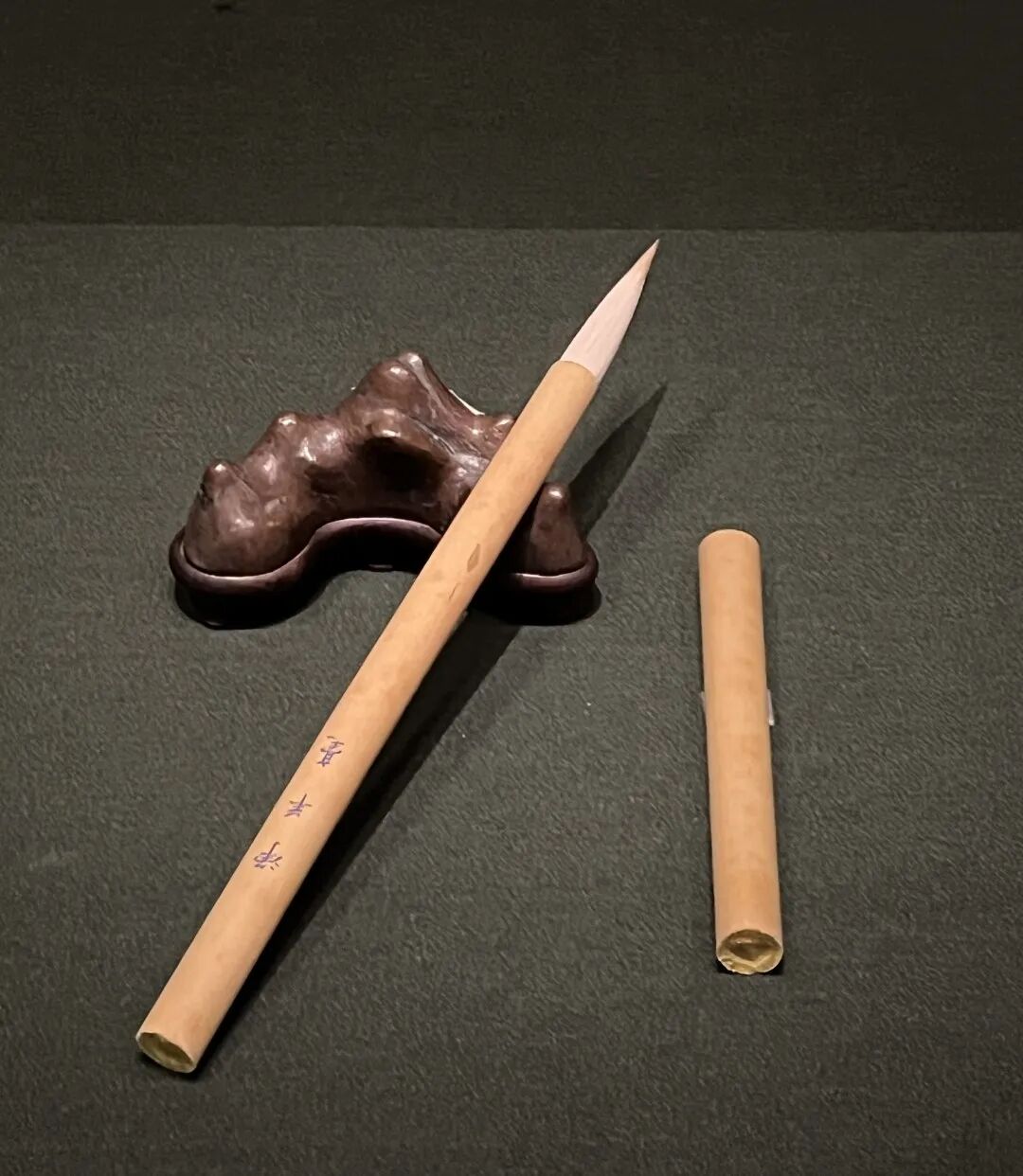 此笔管质朴简洁,选毫精细,笔身刻有“净羊毫”字样,应为清晚期宫廷日常用笔。笔架,又称笔床或笔山,山恋式笔架自唐代兴起之后,一直为各代笔架造型之主流。此笔架旧藏上书房,应是皇子日常书写所用。