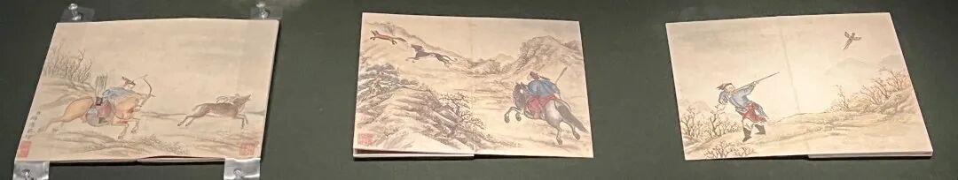 绵亿(1764-1815 年)为乾隆帝之孙,永琪第五子,自幼工书擅画。此册共四开,所画内容依次为“拈箭查验、枪击飞雁、策马追狐、弯弓射雁”,可谓满族王公贵族生活的真实记录,从多角度真实地反映了清代皇室贵族的射猎生活。