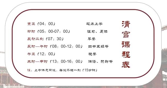 皇子们有多忙呢?让我们来看看清宫课程表。没有现代教育中寒暑假的概念,一年 365 天,只有元旦、端午、中秋、万寿(皇上的生日)、自寿(自己的生日)才放假,连除夕也不放假,至多早一点放学而已。