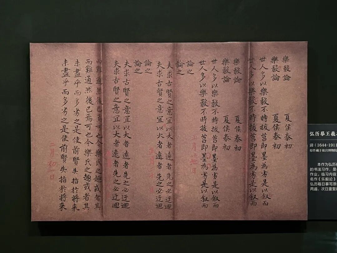 弘历在雍正八年的书法习作,临习了书圣王羲之楷书名作《乐毅论》。通过作品可知,弘历每日摹原帖文字两行,每行两遍,次日重复前日内容。