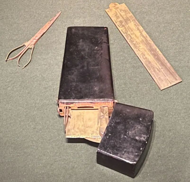 该套绘图仪器共 11 件,装于黑漆皮木盒之中,包含半圆仪、图规、鸭嘴笔及各种尺子等,制作精巧,便于携带,用于日常测量及绘图。康熙帝喜爱天文及数学,出行时也会亲自教导皇子使用各种仪器,井进行画图。