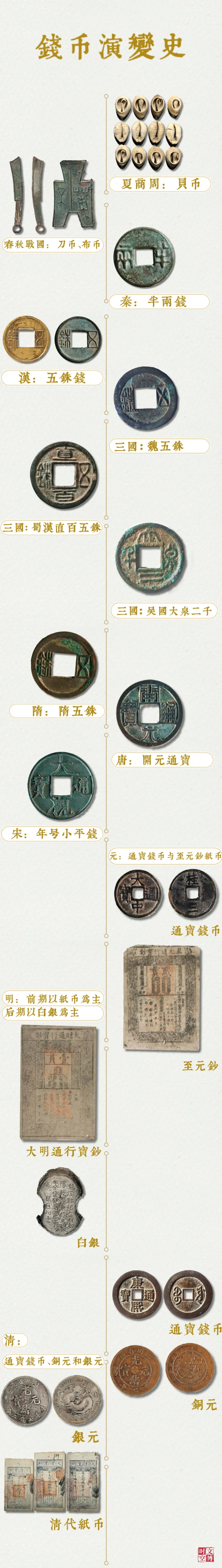 中国是农业大国,最初,“钱”并不是指货币,它的读音在那时为jiǎn,是一种农具,也就是我们今天的铲子。而铜币又被称为“布”,是“镈”的假借词。镈的读音为 bó,相当于我们今天的锄头。所以《诗经·周颂·臣工》上说:“命我众人:庤(zhì)乃钱镈,奄观铚(zhì)艾(yì)。”其意为告诉农夫们,让他们备好锄铲等农具,同看收割的情景。锄头从一种农具演变成货币的代名词,代表着我国古代农业经济所占的主导地位。春秋战国时期的布币就是由“钱”演变而来的。其形制演变经历了从空首到平首,厚重到轻薄,无文到有文,字少到字多的过程。币文内容主要为纪地(铸地)、纪重。秦汉时期的半两、三铢、五铢钱也一直沿袭钱文纪重的传统。