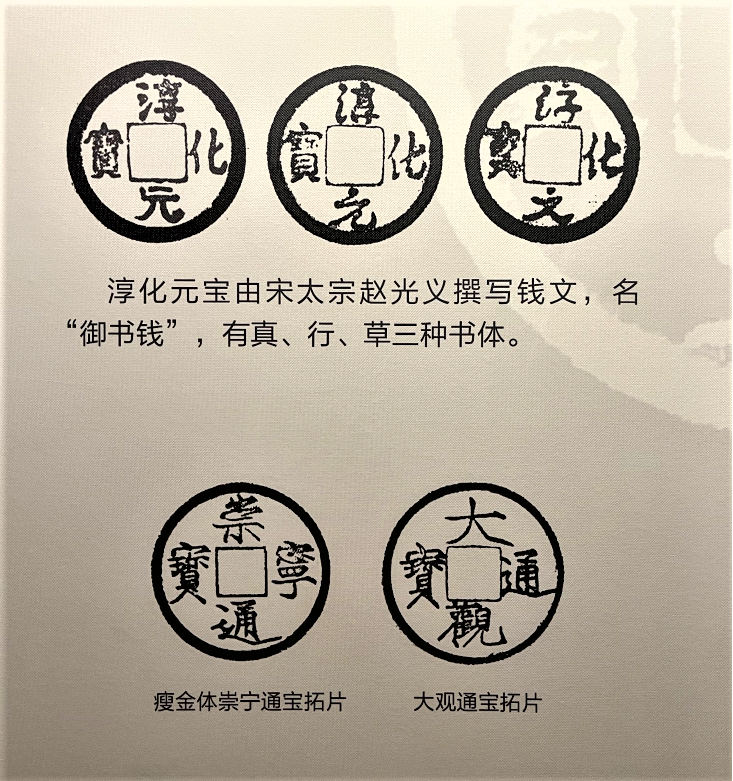 宋代钱币中,最值得一提的便是“钱文”文化。宋代“钱文”文体多种多样,篆、隶、真、行、草五种书体应有尽有,异彩纷呈。最为可人的是,皇帝宋太宗赵光义亲书钱文,开创了“御书钱”之先河,在这些通货中有一部分可以组拼成“对钱”,成为我国历史上的一大创举。宋代年号钱成为制度,一部宋代货币史也是一部宋代政治史。