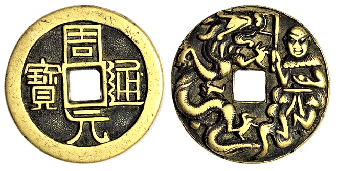 周元通宝背面是高浮雕图案“苍龙教子”,典故源自于《三字经》里的四句话,“窦燕山,有义方。教五子,名俱扬。”窦燕山者,原名窦禹钧,五代后晋时人。他是当地有名的富户,但为富不仁。不知是否因为他做事缺德,到了 30 岁还没有子女。一天晚上做梦,他死去的父亲对他说:“你心术不好,恶名彰著,如不痛改前非,不仅一辈子没有儿子,也会短命。”从此,窦禹钧幡然悔悟,克已利人,广结善缘,还在家里办起了私塾,延请名师教课,免收学费。后其妻连生五子,燕山也官至谏议大夫,寿享八十有二。孔子曾言:“其身正,不令而行。”燕山身教、言传,培育五子先后成人成才,时人以苍龙喻窦燕山,五子称“窦氏五龙”,“五子登科”也由此而来。