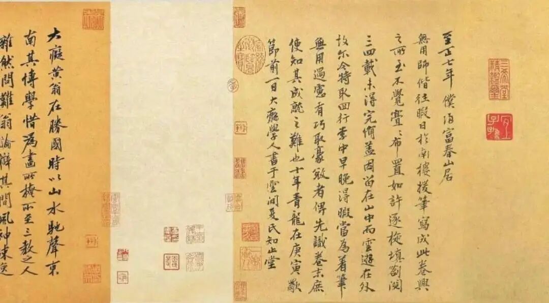 《富春山居图》甫一问世便名动江湖。黄公望的朋友郑无用就曾担心此卷遭人巧取豪夺,题识上就有“无用(即无用师)过虑有巧取豪夺者,俾先识于卷末,庶使知其成就之难也”的记录。而后此画传世600余年的经历可谓跌宕起伏,险象环生。