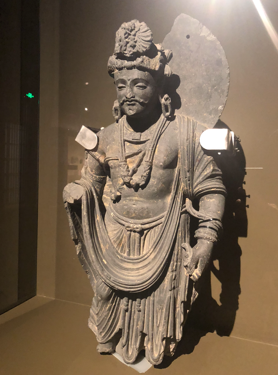 在布袋和尚出现之前,弥勒的形象最早出现于犍陀罗,在此次故宫展览中可以见到初始形象:一位留着胡子、头戴宝冠、变身珠玉的希腊化印度王子穿搭的菩萨。