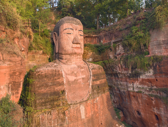 这样的弥勒形象在五代以前,曾是国内主流。雕刻于唐代、举世闻名的四川乐山大佛(即凌云寺大佛,高 71 米)——这尊世界上最大的石佛,就是弥勒,不过肚子并不大,其“庄严宝相”与乐呵呵的大肚弥勒也大相径庭。