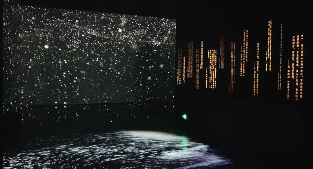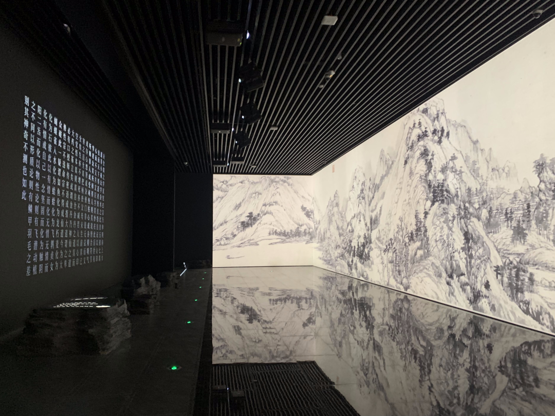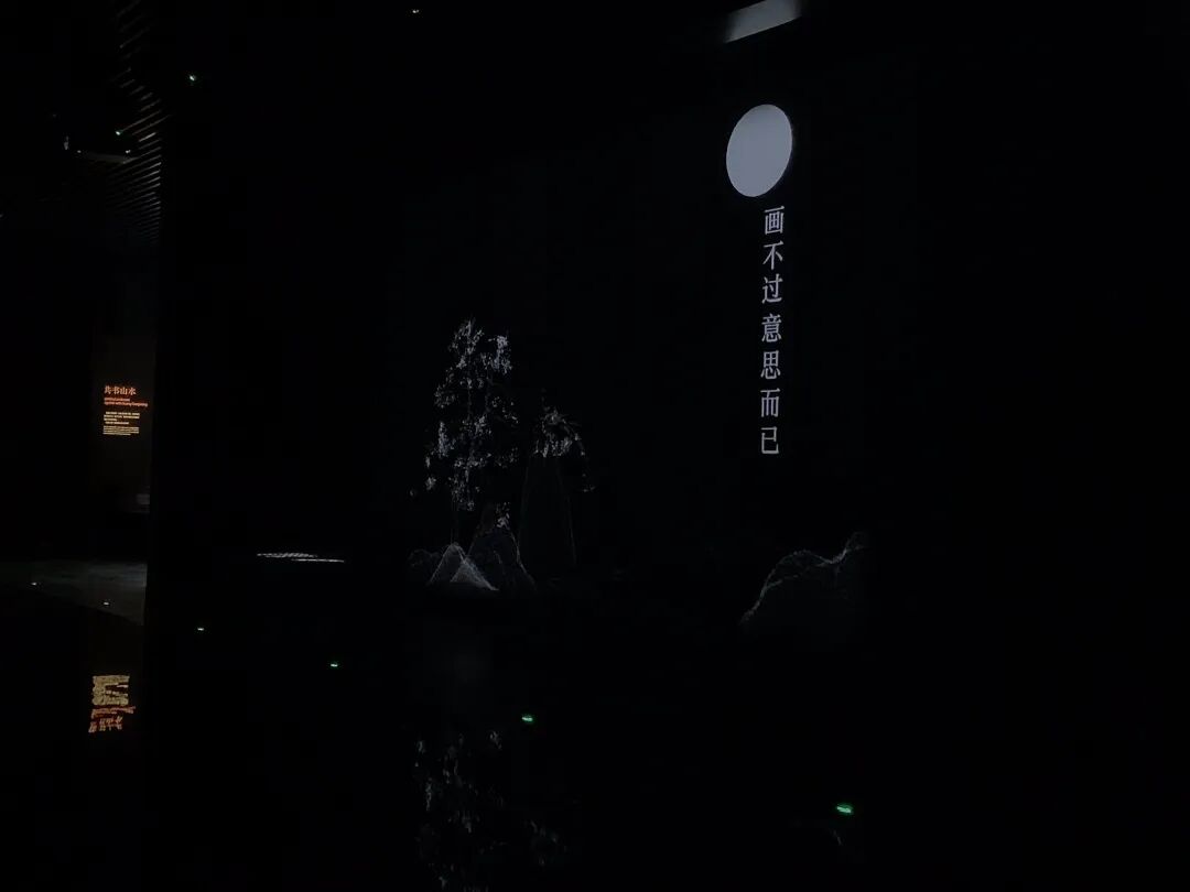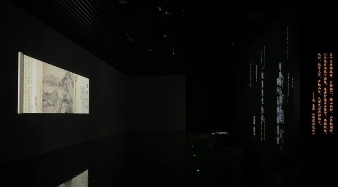 真迹厅屏幕前的仿真石块上以及后方幕墙上,投影的是黄公望流传下来的文字,以及朋友们与他的往来信札诗文、他的画论《写山水诀》、《纸舟先生全真直指》(金月岩编 黄公望传)。这部分的设计是对他道学、画学思想的梳理与呈现。